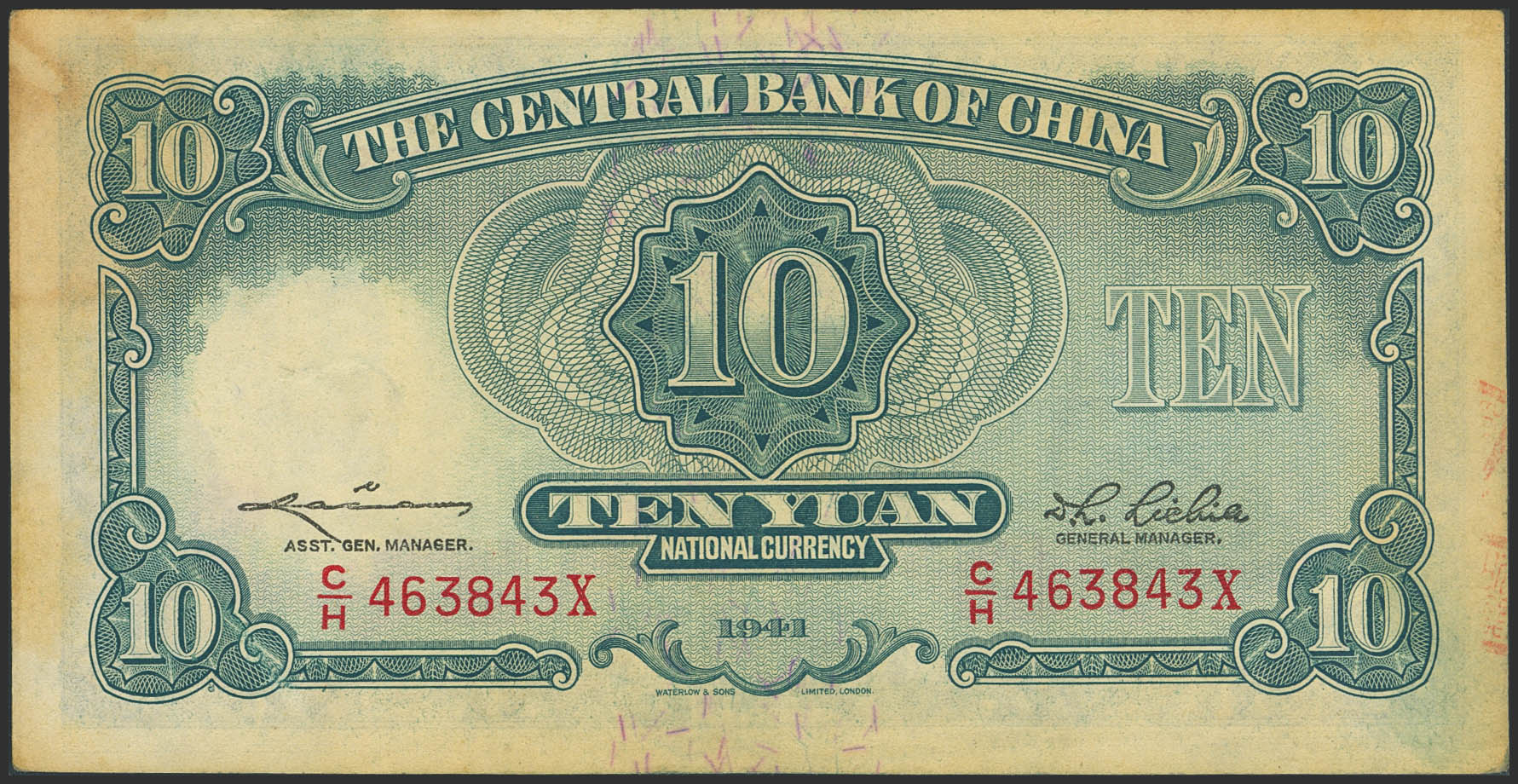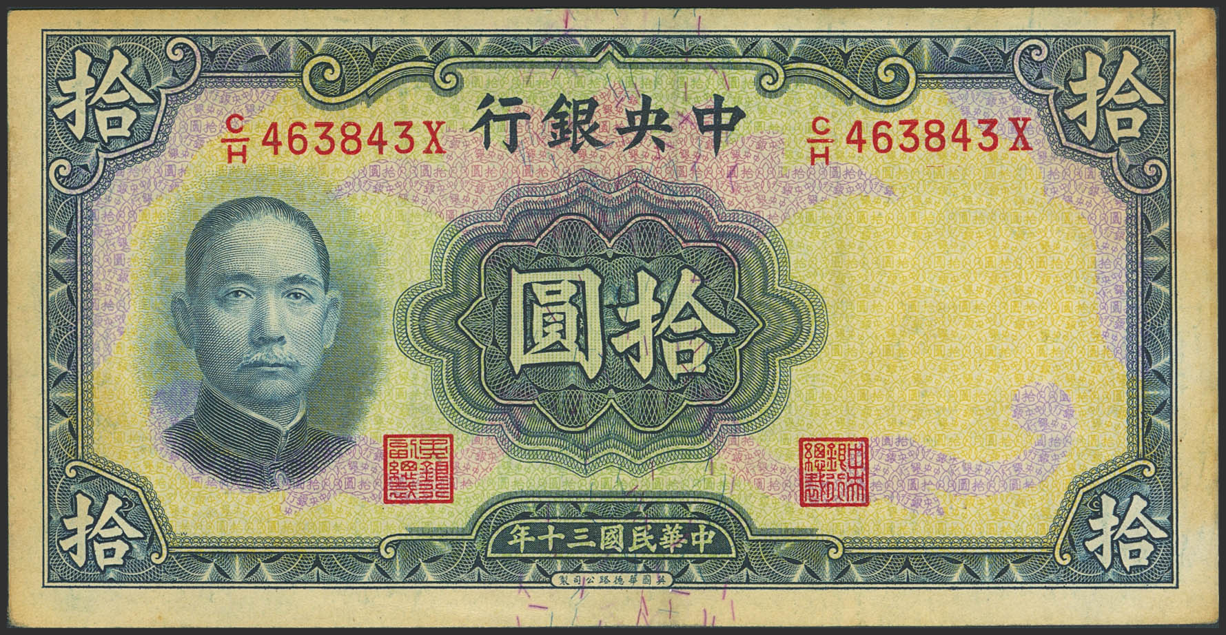 CHINA. 10 Yuan. 1941. Central Bank of China. (Pick: 237d). Almost Uncirculated.