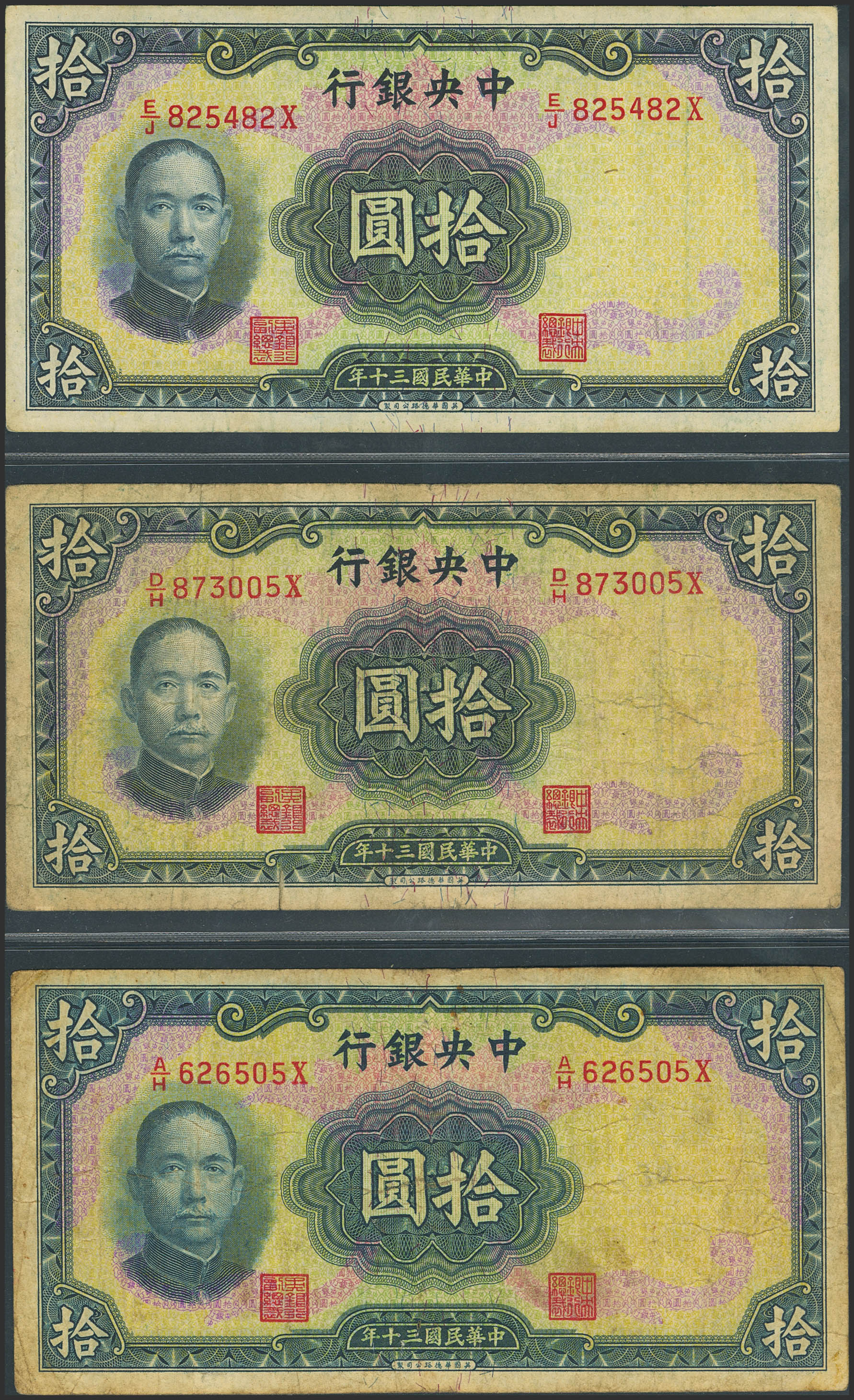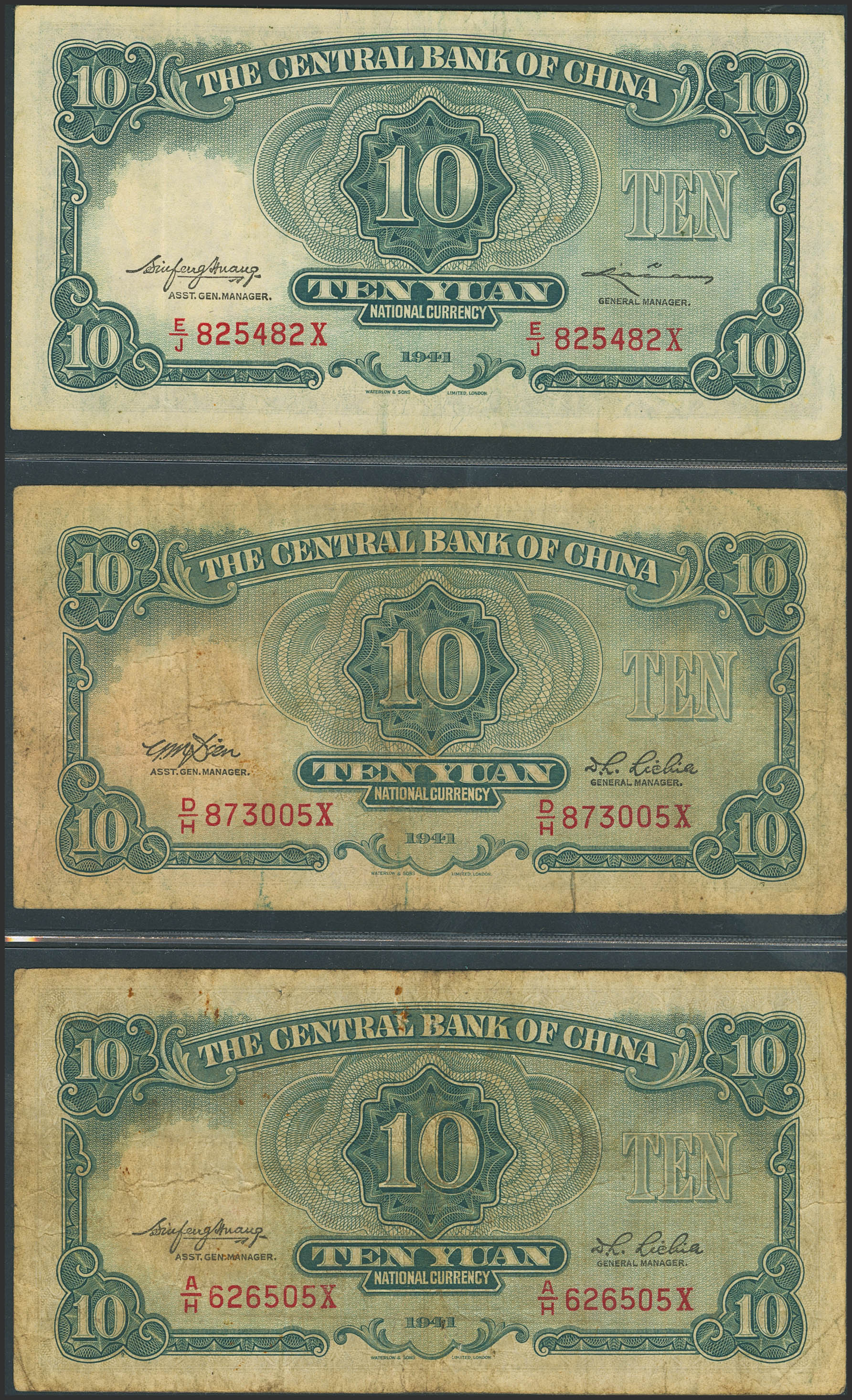 CHINA. Lot of 3 notes of 10 Yuan. 1941. Central Bank of China. (Pick: 237a, 237B, 237e). Fine (2) and Very Fine (1).