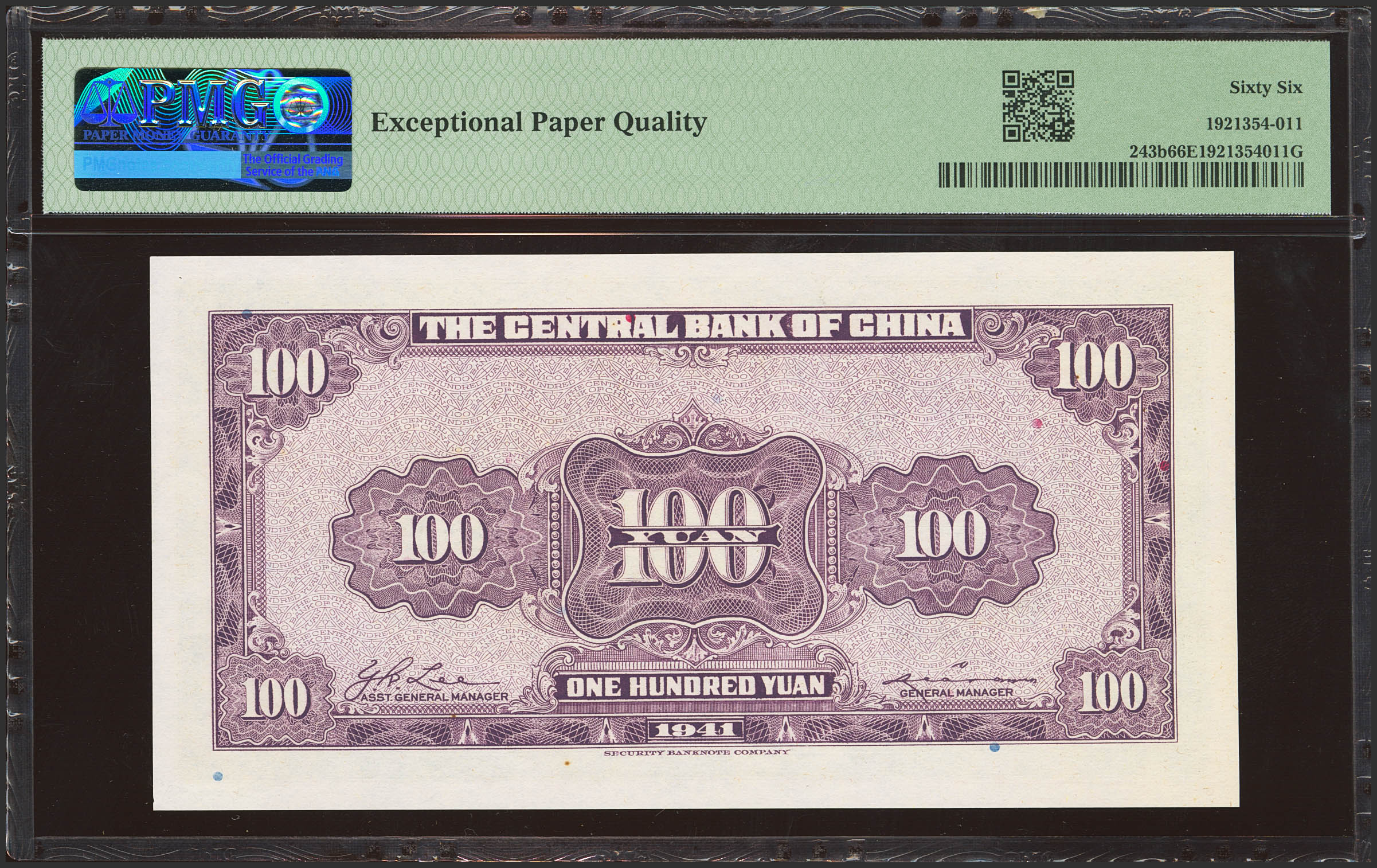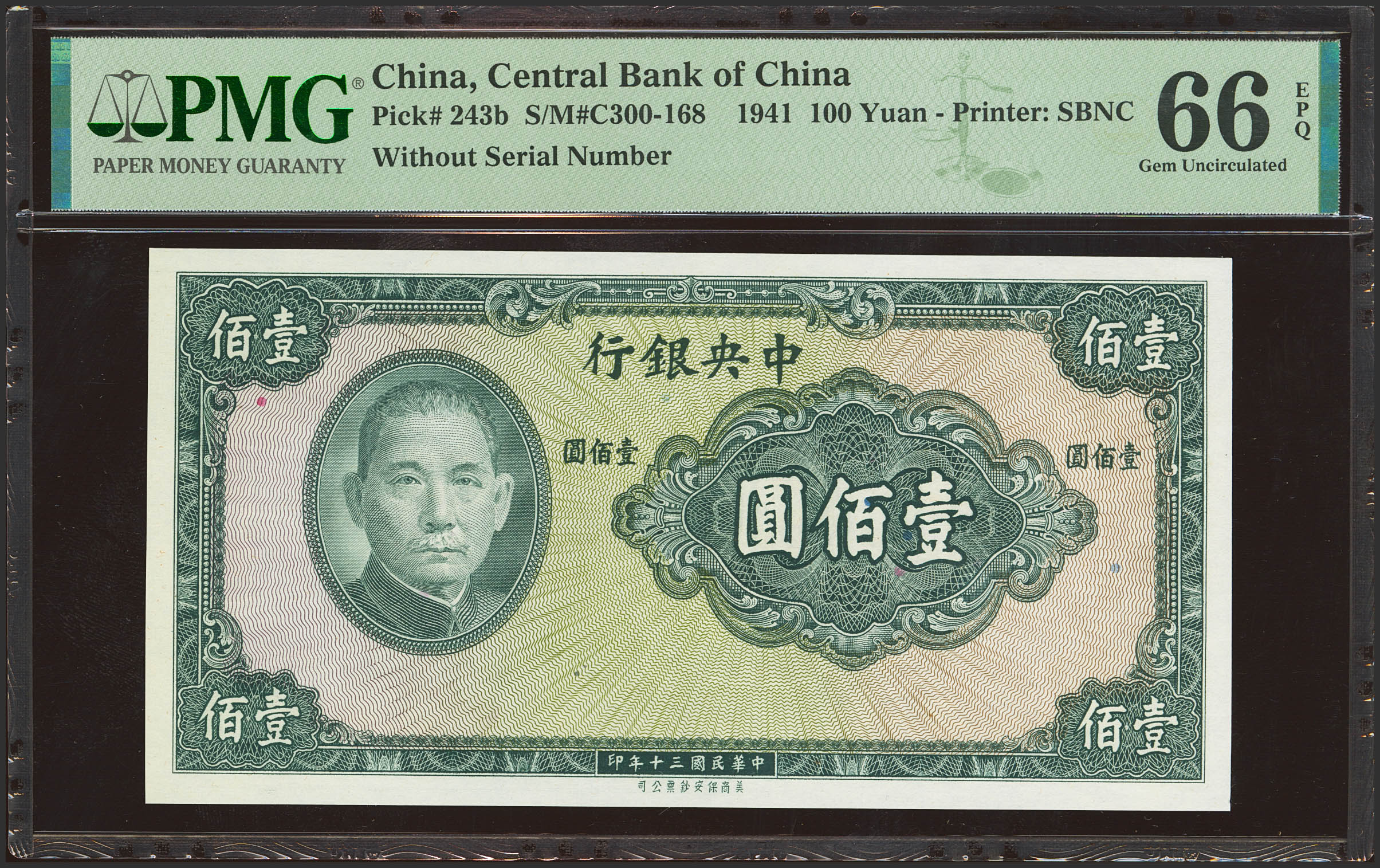 CHINA. 100 Yuan. 1941. Central Bank of China. Without serial. (Pick: 243b, SM: C300-168). PMG66EPQ.