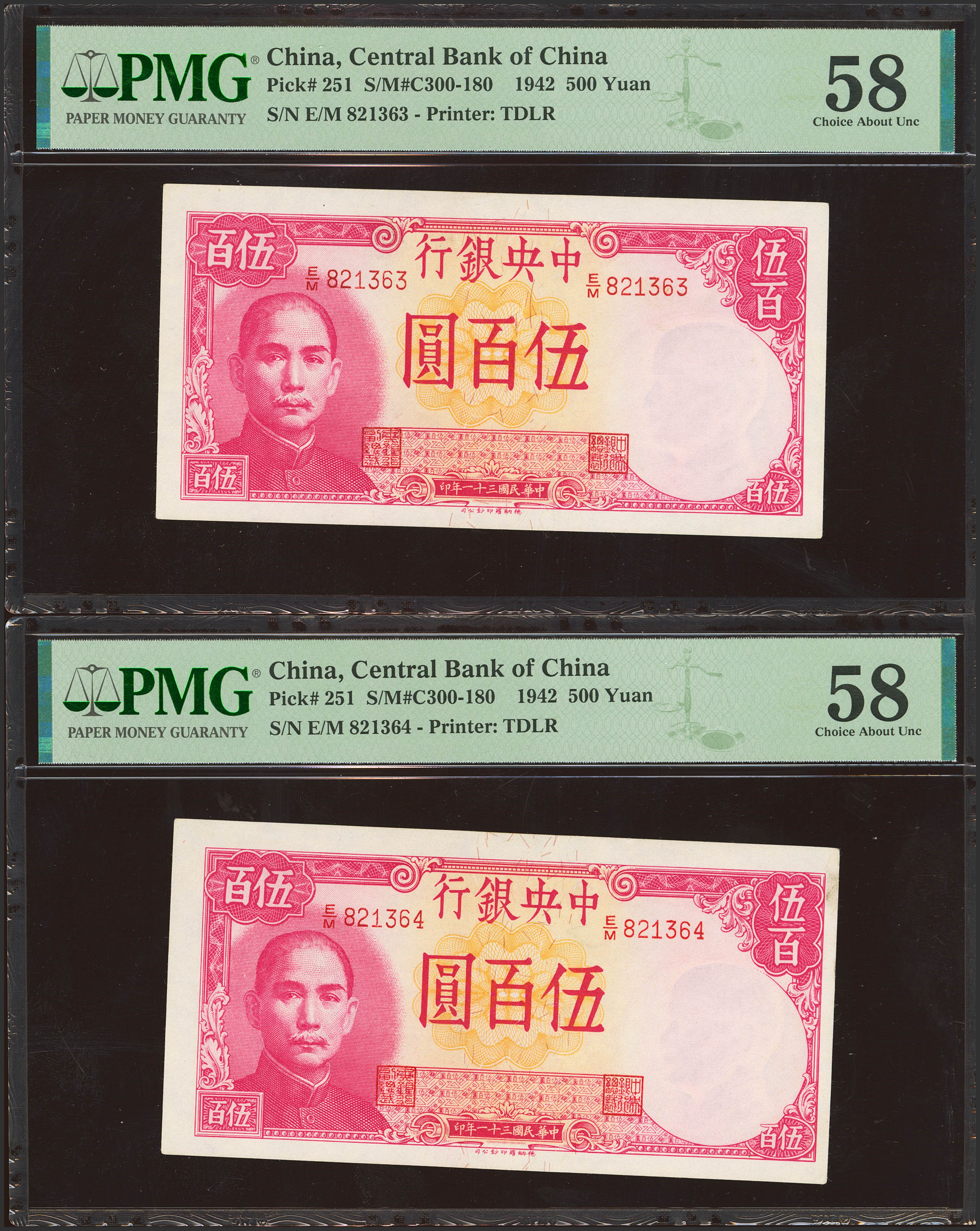 CHINA. Lot of 2 notes of 500 Yuan. 1942. Central Bank of China. Consecutive notes. (Pick: 251, SM: C300-180). PMG58, both.