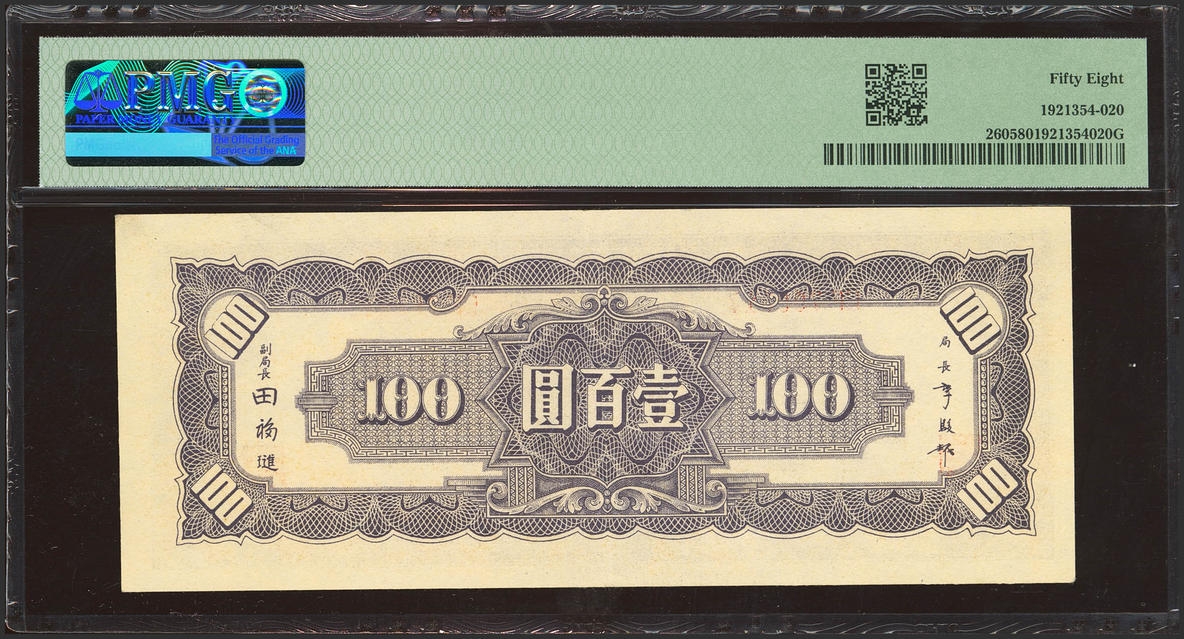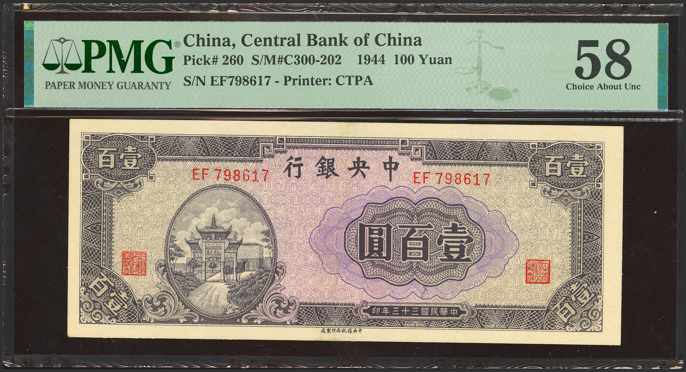 CHINA. 100 Yuan. 1944. Central Bank of China. (Pick: 260, SM: C943). PMG58.