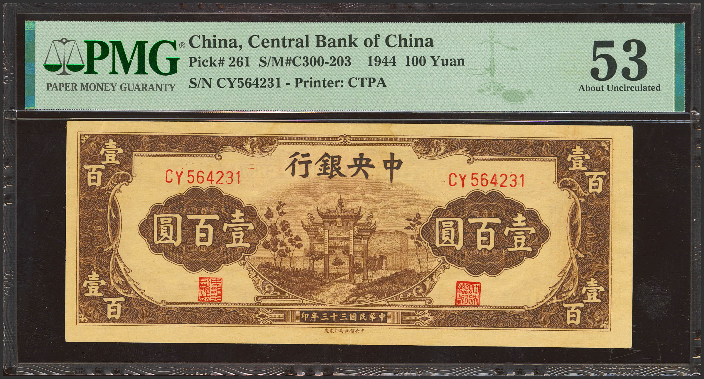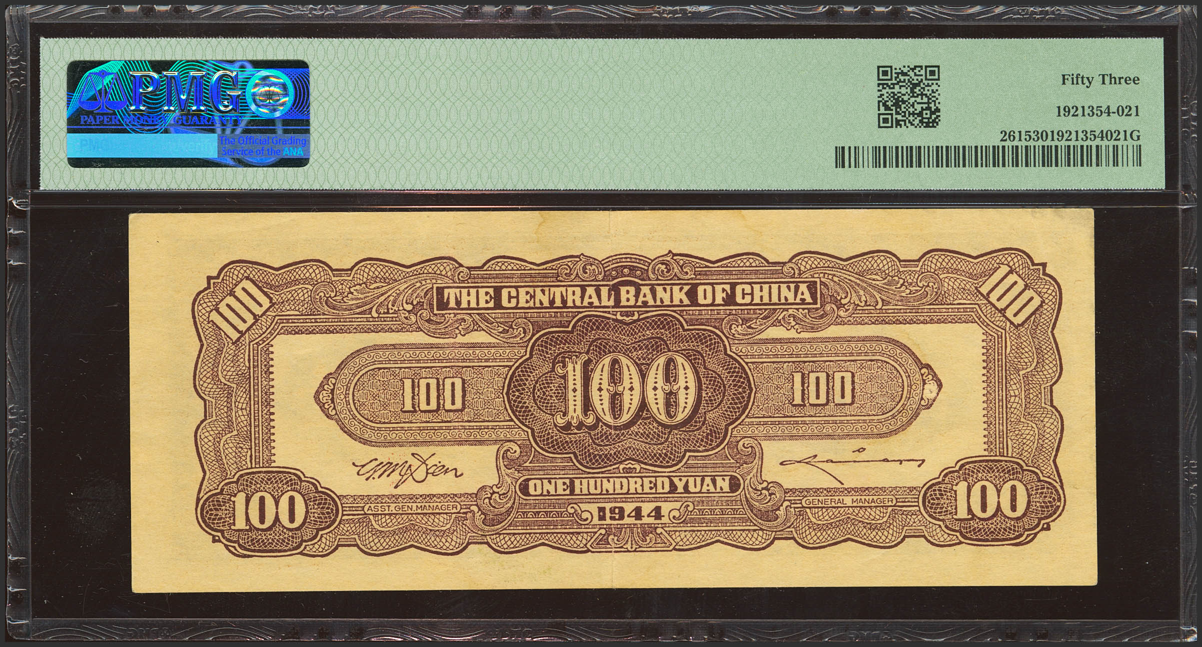 CHINA. 100 Yuan. 1944. Central Bank of China. (Pick: 261, SM: C300-203). PMG53.