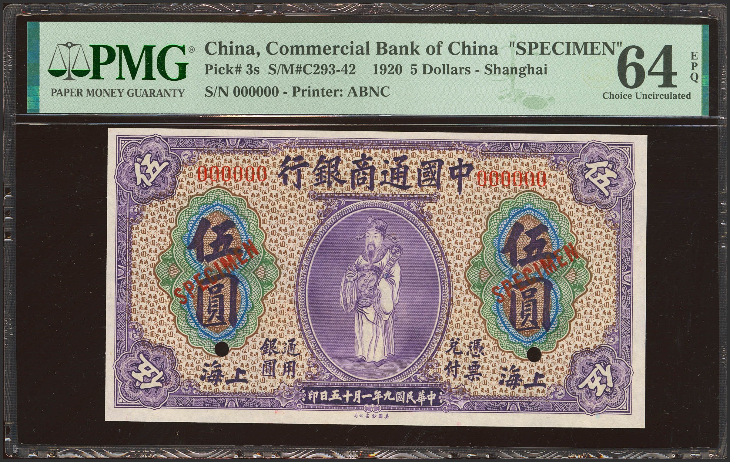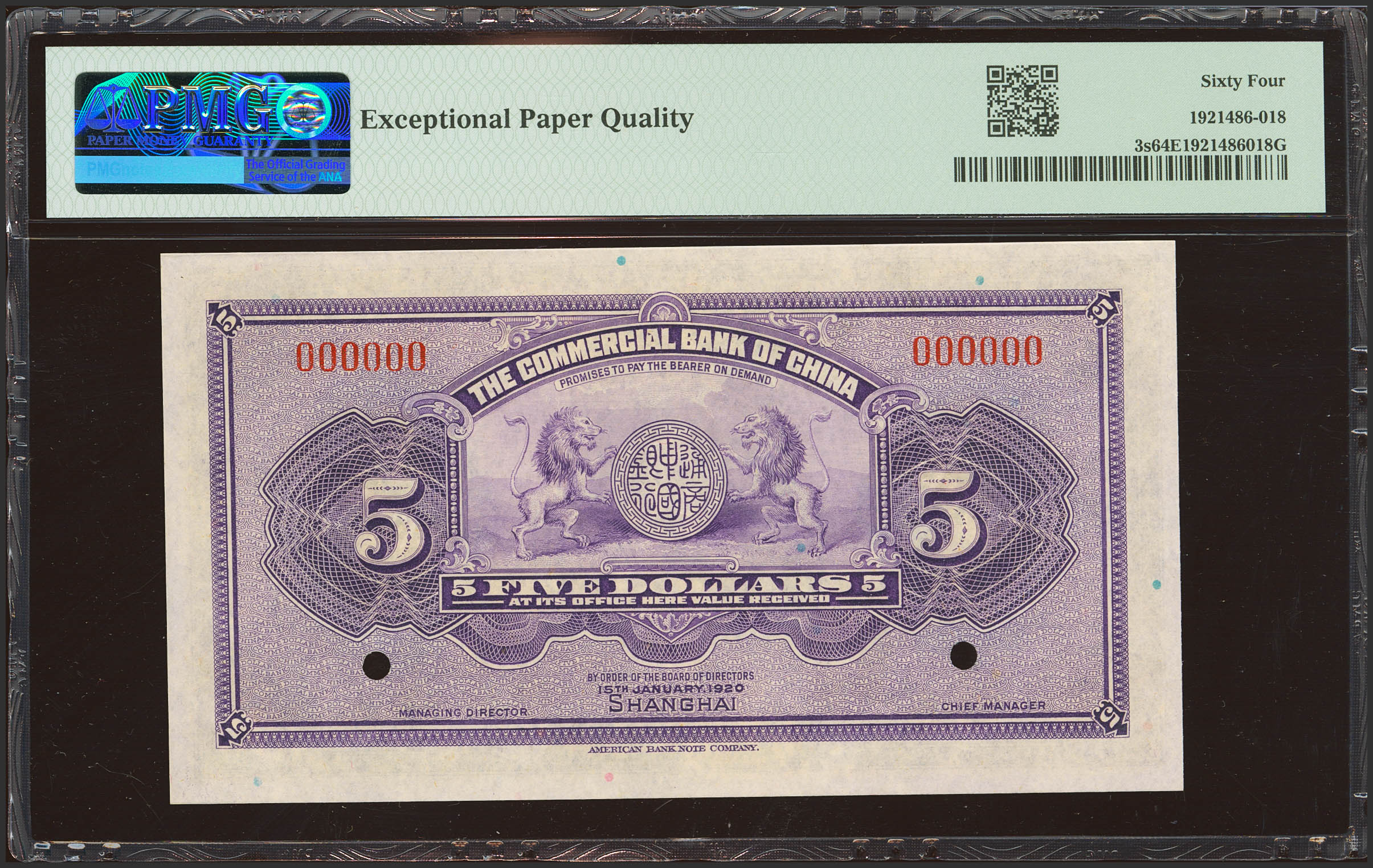 CHINA. 5 Dollars. 15 January 1920. Commercial Bank of China. Specimen. (Pick: 3s, SM: C293-42). PMG64EPQ.
