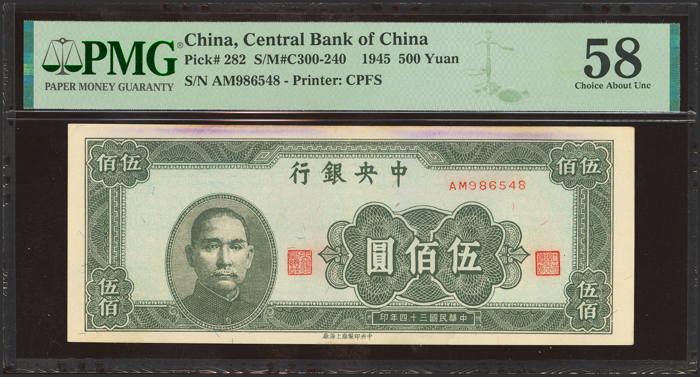 CHINA. 500 Yuan. 1945. Central Bank of China. (Pick: 282, SM: C300-240). PMG58 (ink).