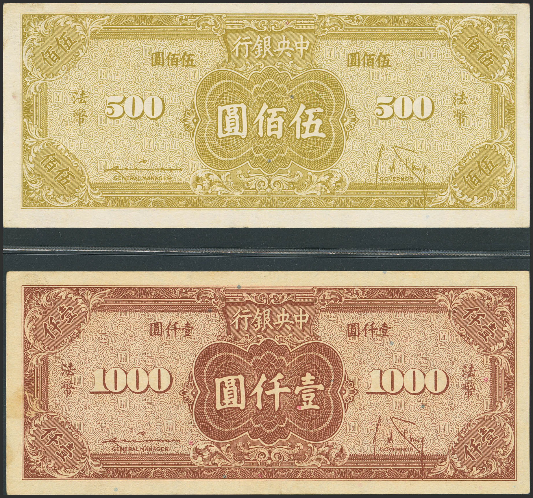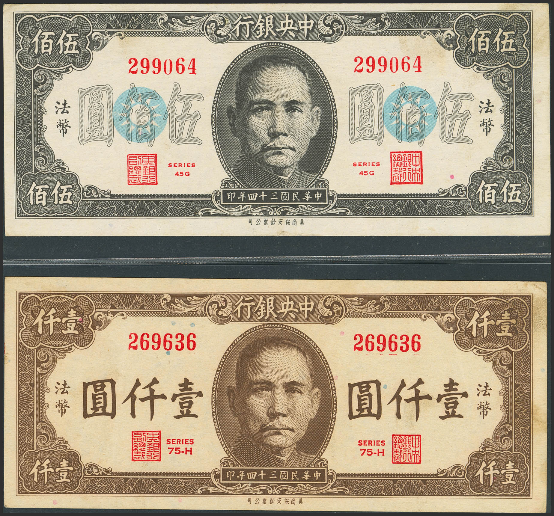CHINA. Lot of 2 notes of 500 and 1000 Yuan. 1945. Central Bank of China. (Pick: 283a, 289). More than Extremely Fine and About Uncirculated.