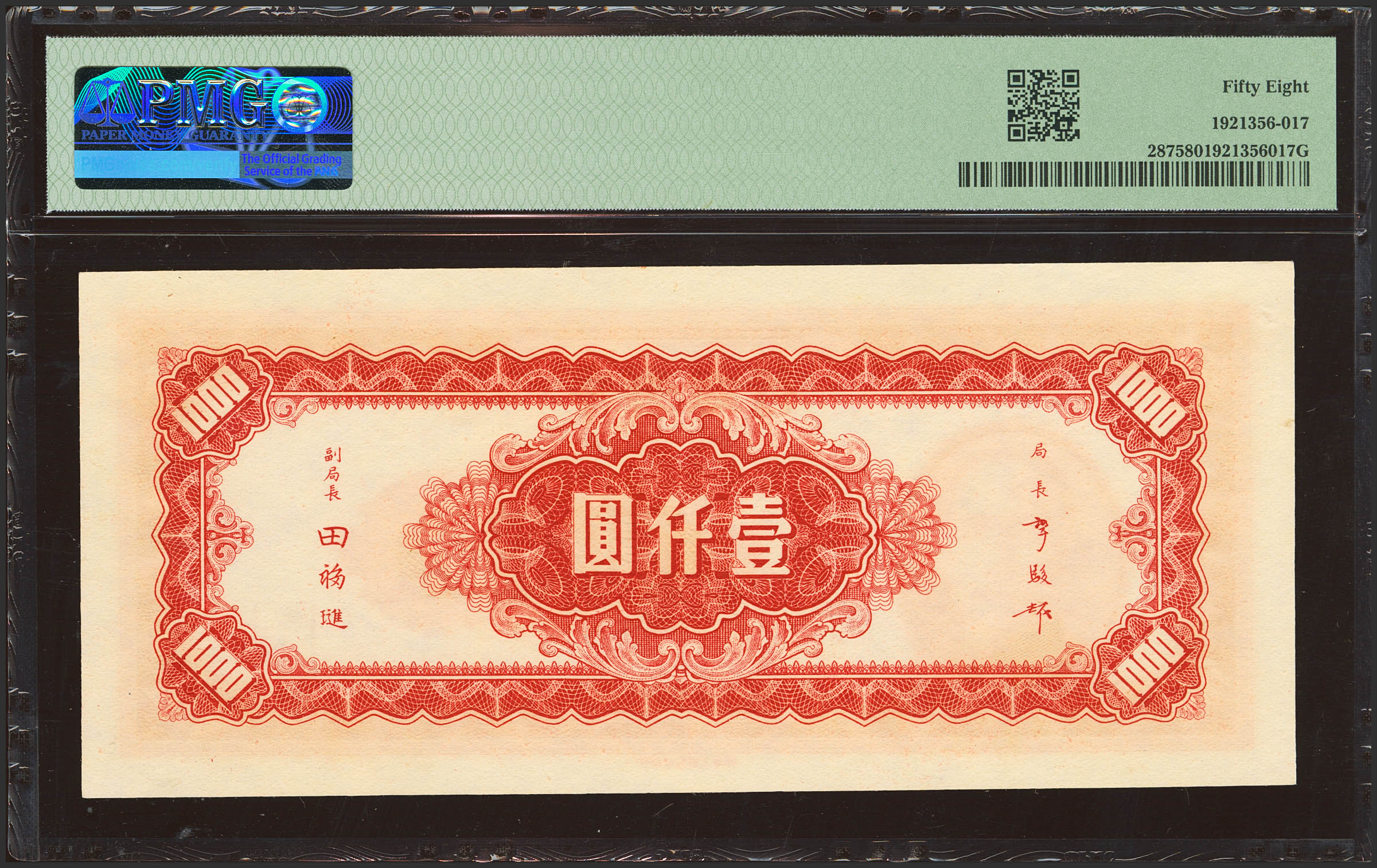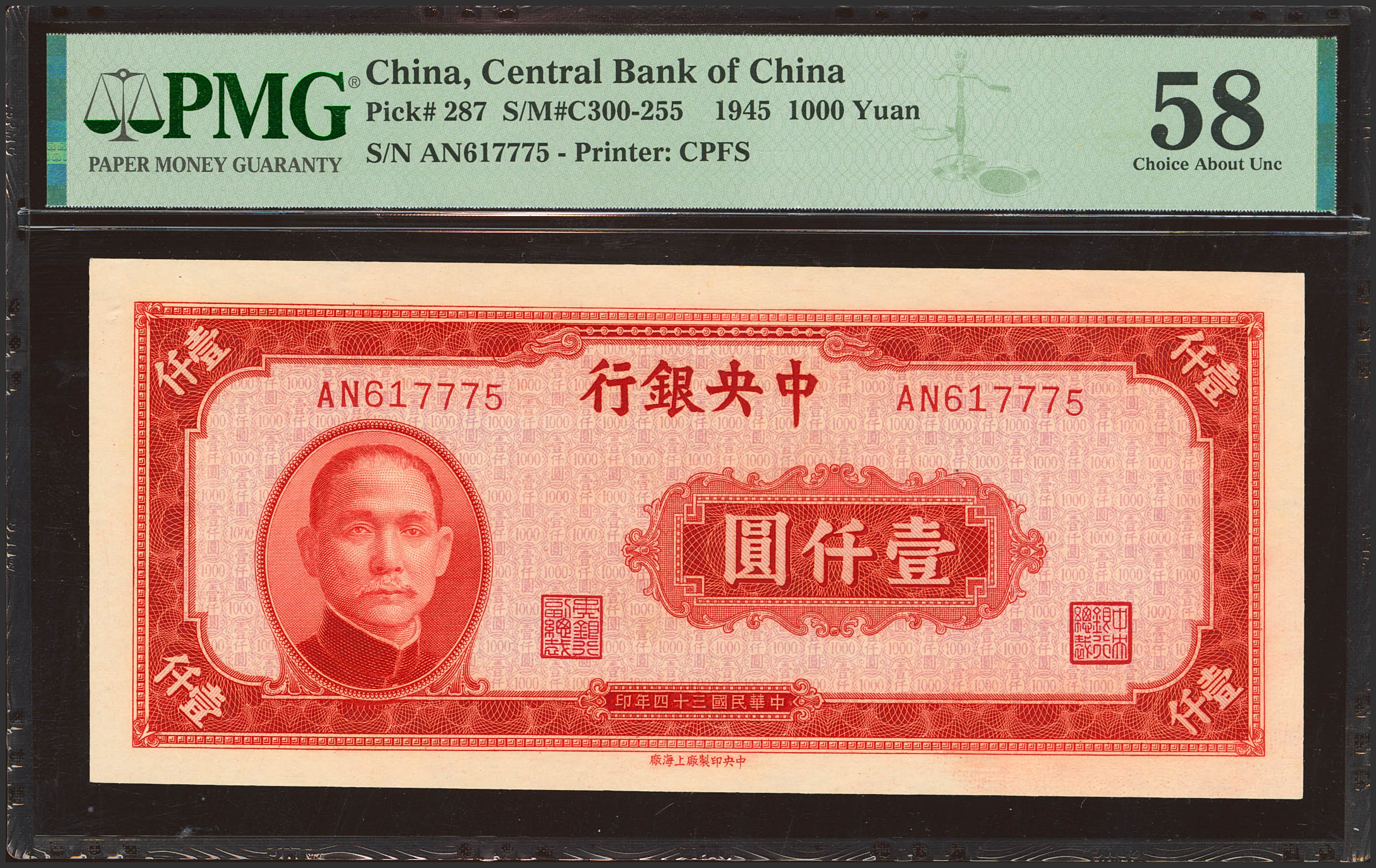 CHINA. 1000 Yuan. 1945. Central Bank of China. (Pick: 287, SM: C300-255). PMG58.
