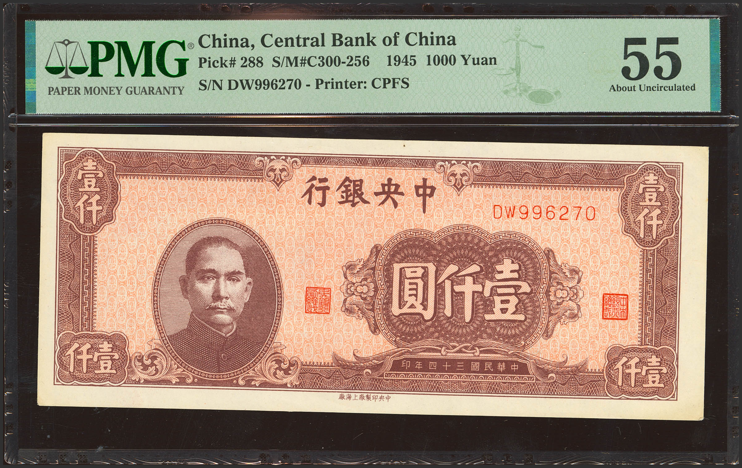 CHINA. 1000 Yuan. 1945. Central Bank of China. (Pick: 288, SM: C300-256). PMG55.