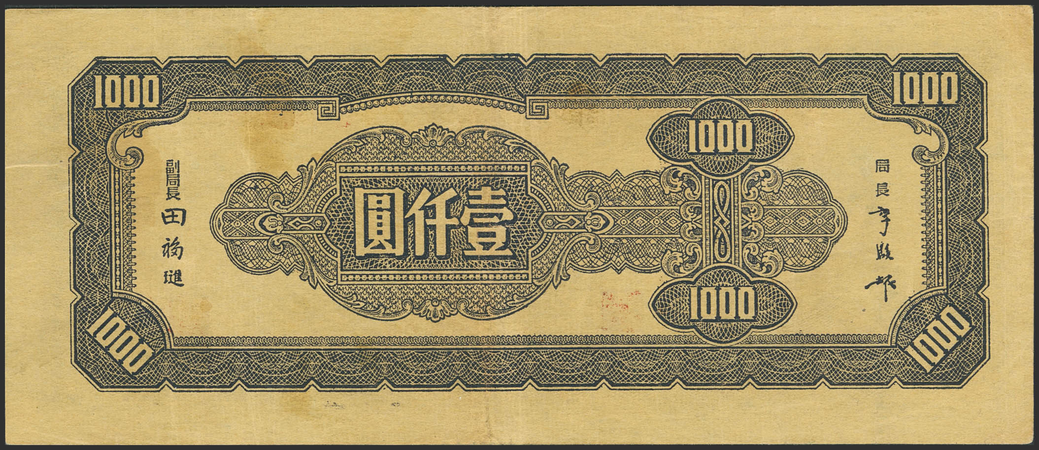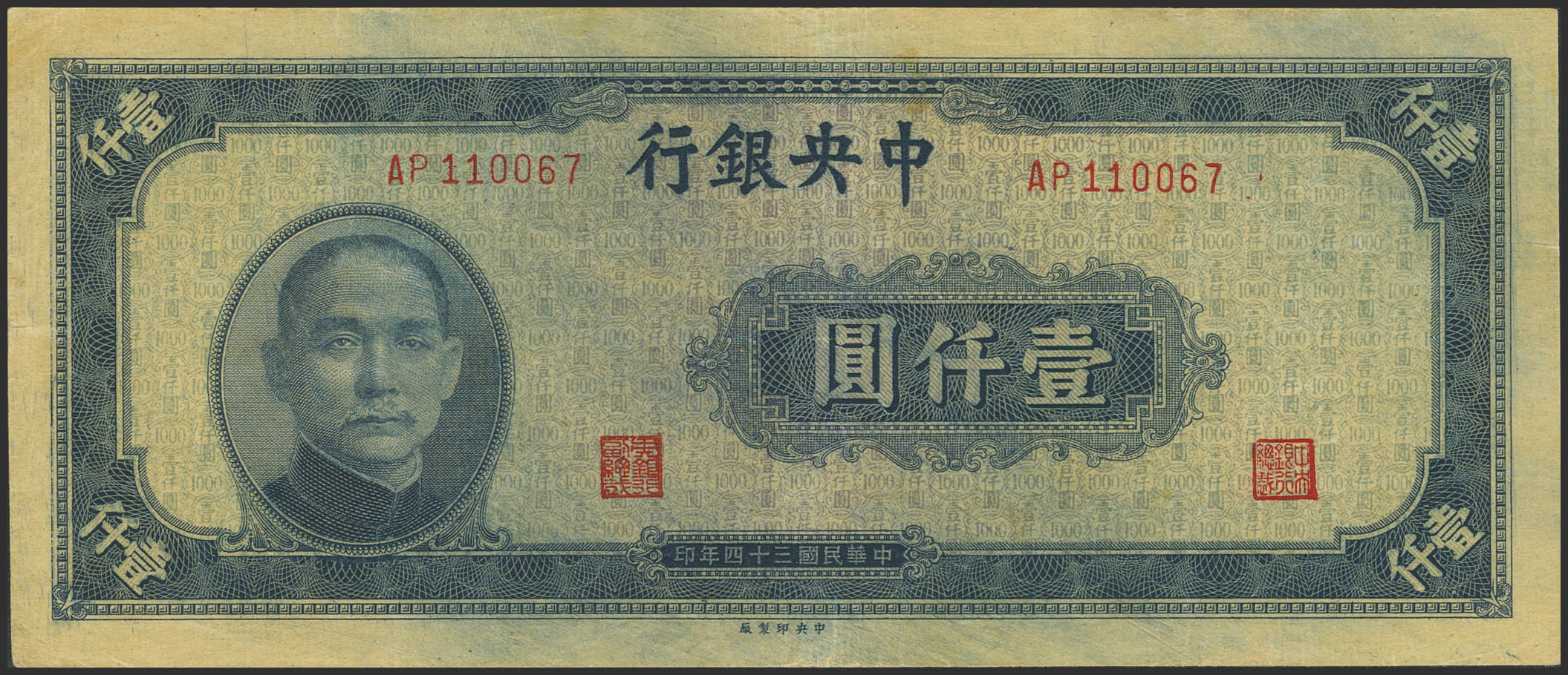 CHINA. 1000 Yuan. 1945. Central Bank of China. (Pick: 295). Very Fine.