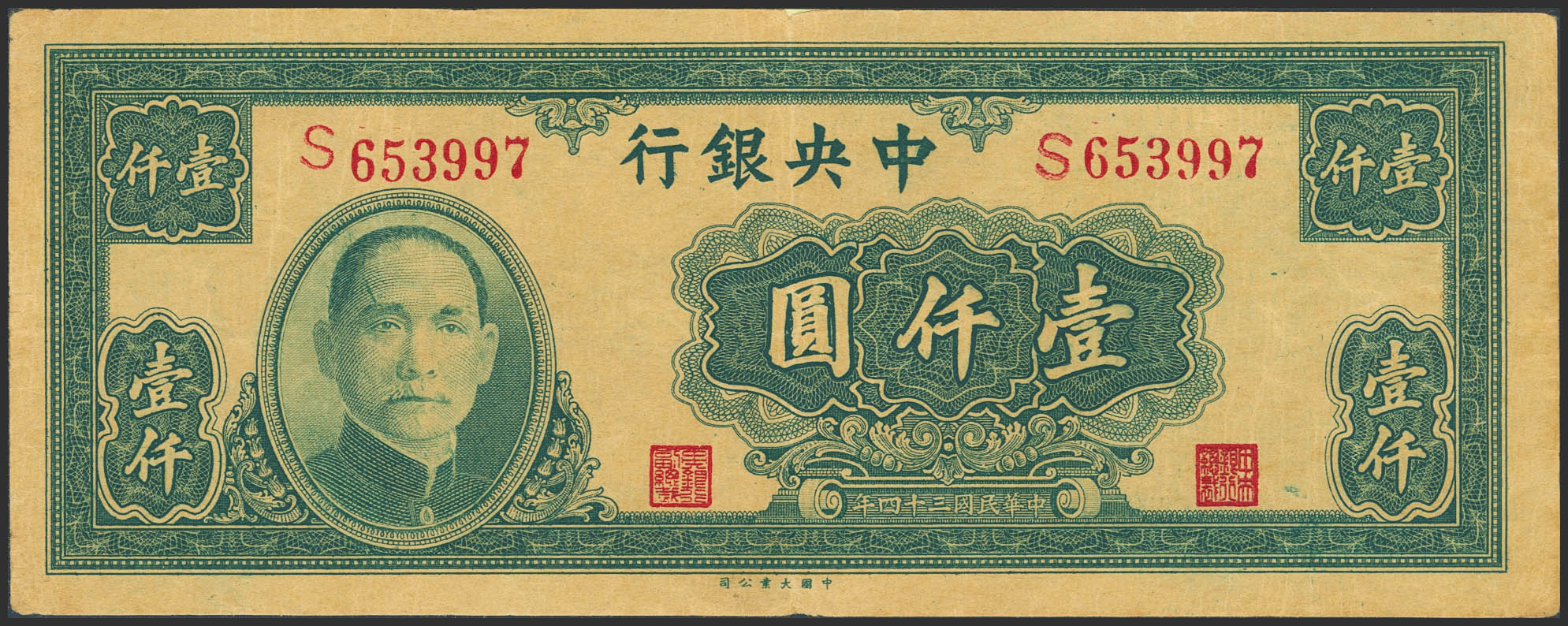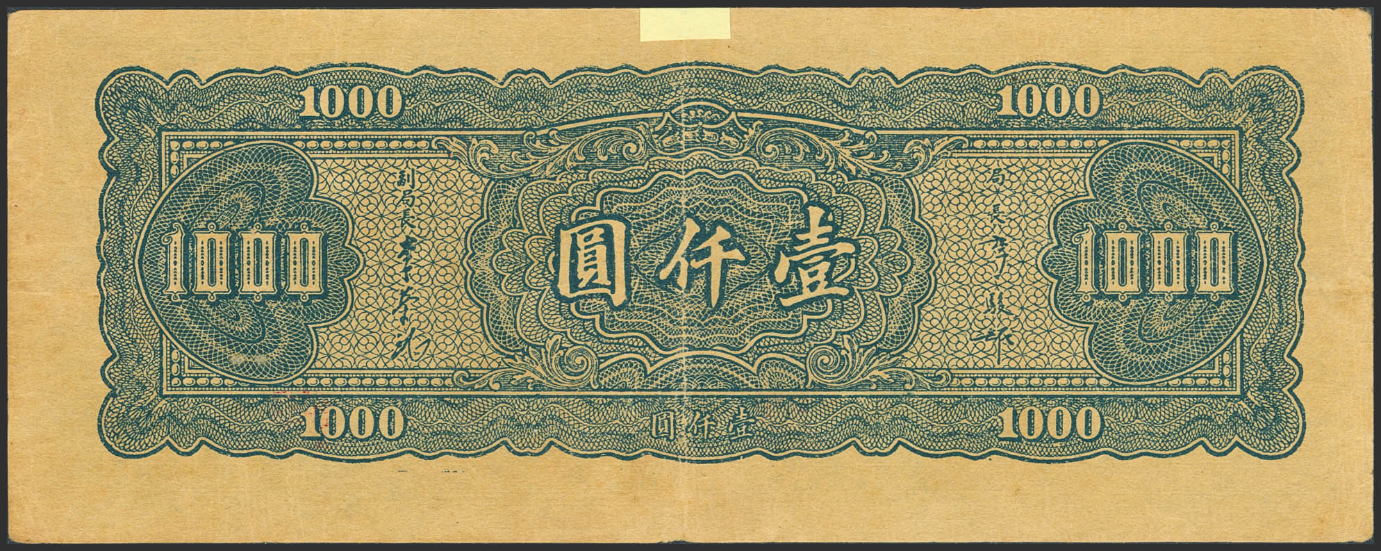 CHINA. 1000 Yuan. 1945. Central Bank of China. (Pick: 297). Paper glued on the top edge. Extremely Fine.