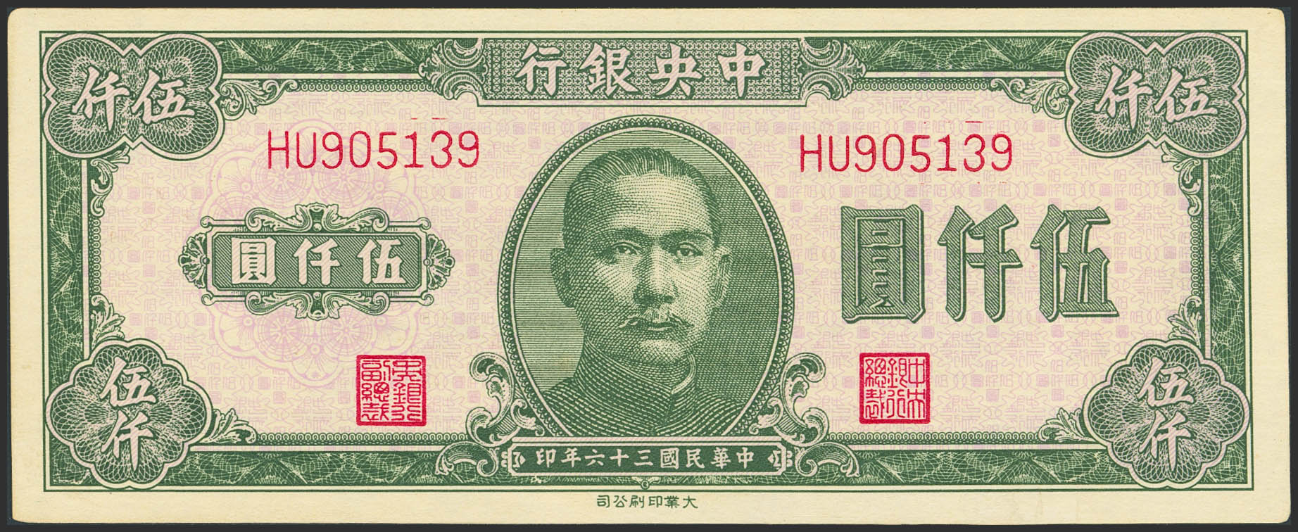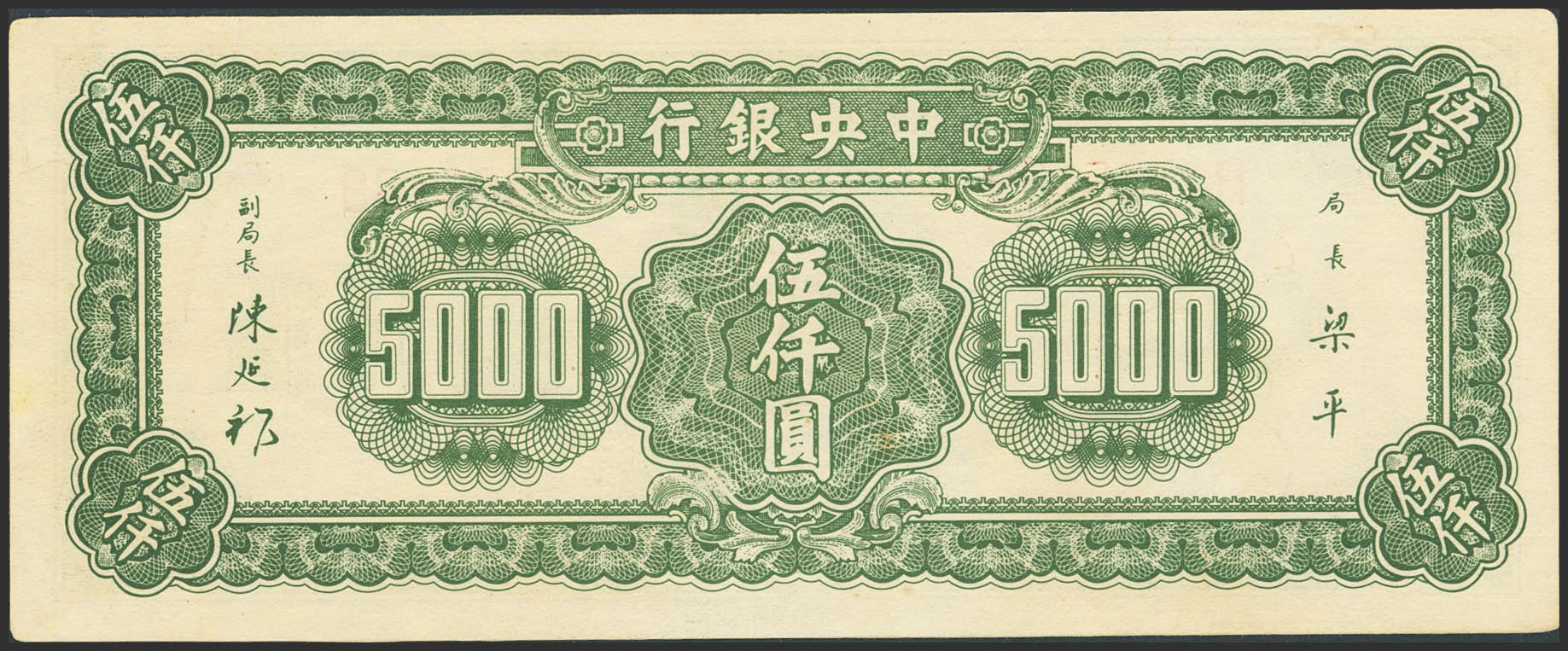 CHINA. 5000 Yuan. 1947. Counterfeit. Central Bank of China. (Pick: 313). Less than Uncirculated.