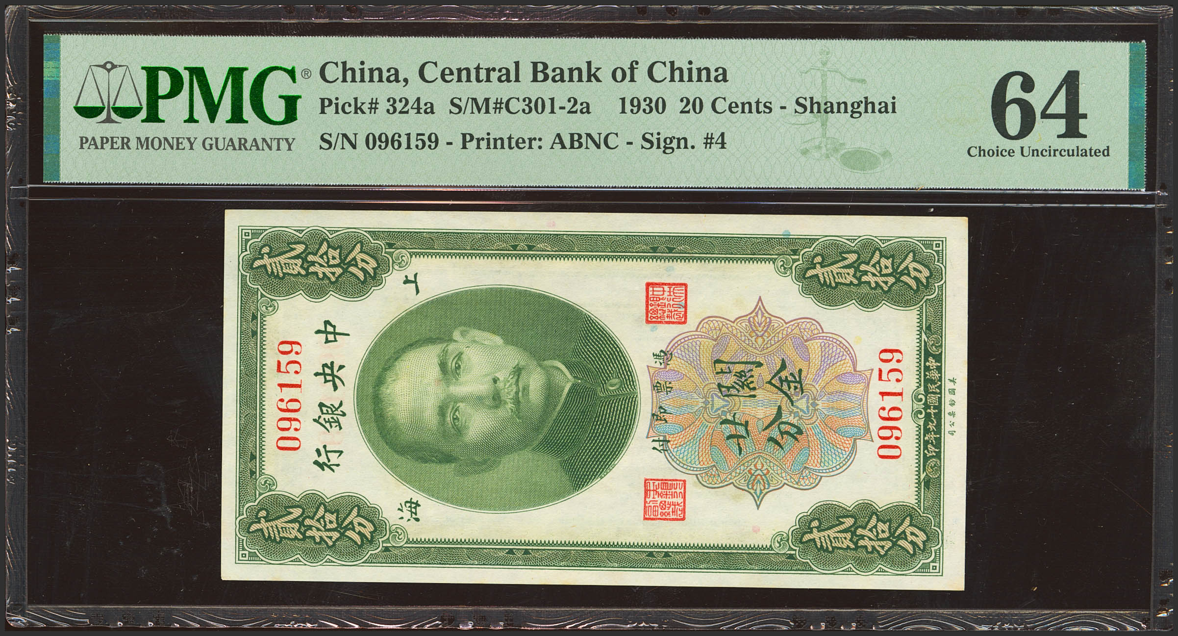 CHINA. 20 Cents. 1930. Central Bank of China. (Pick: 324a, SM: C301-2a). PMG64.