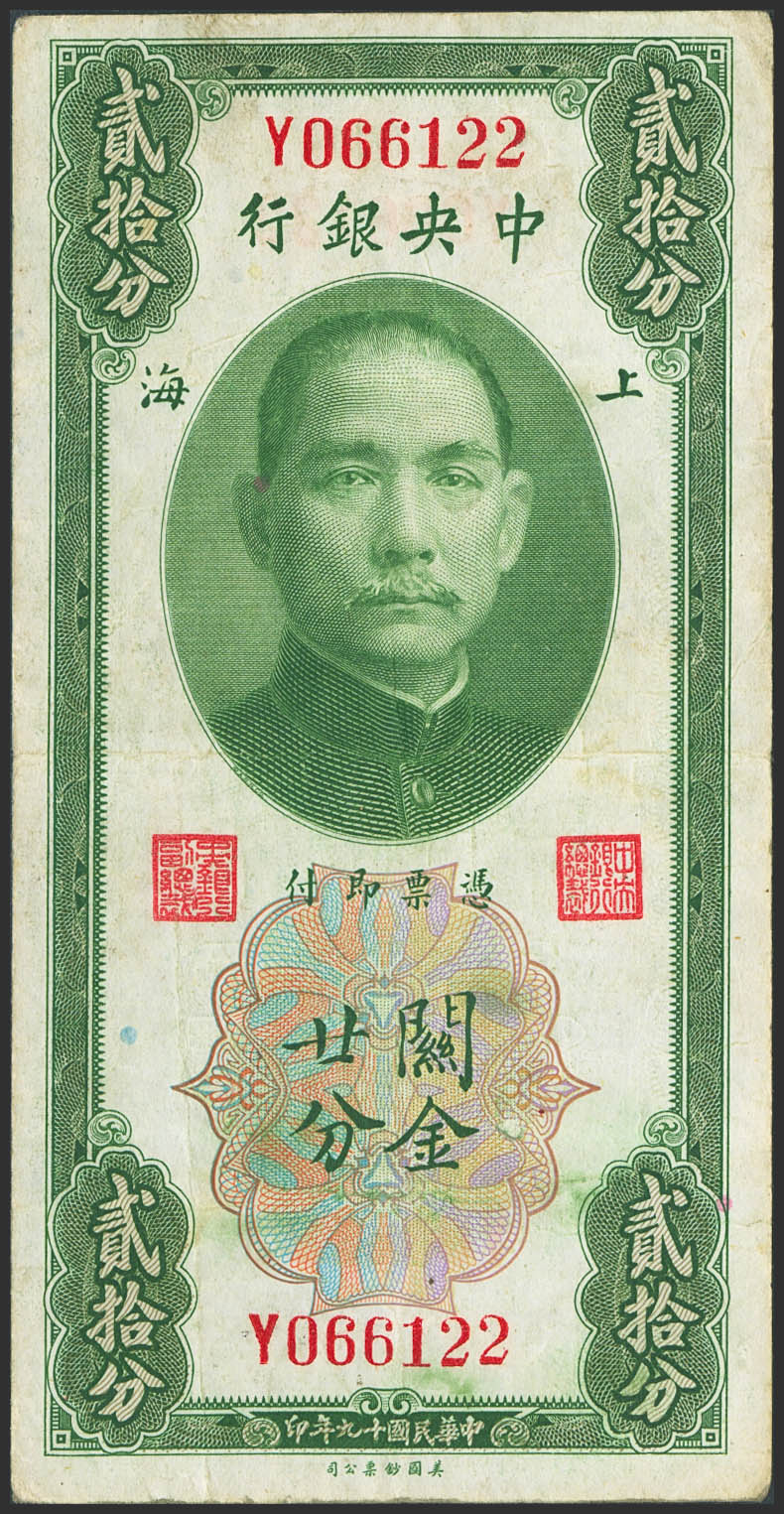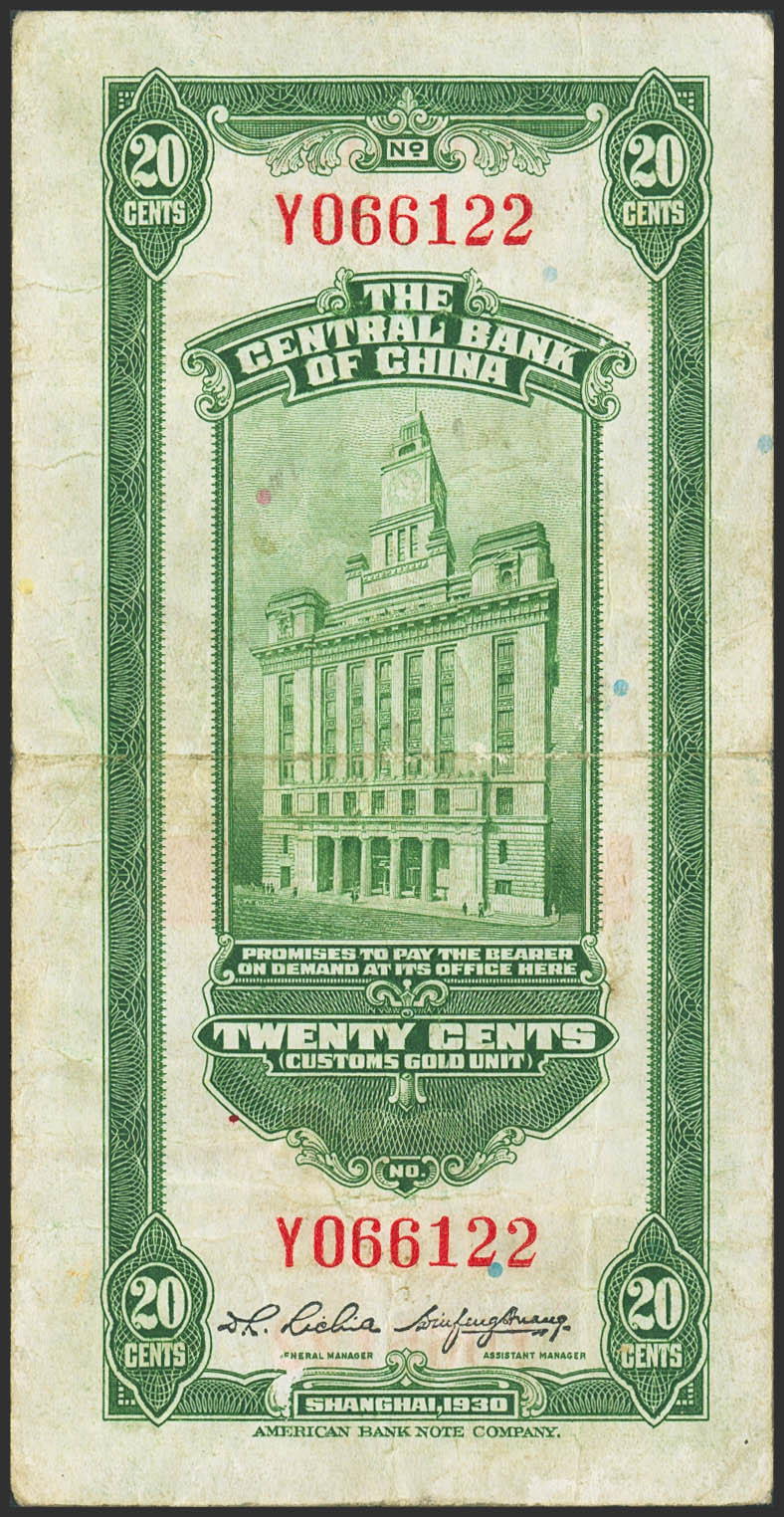 CHINA. 20 Cents. 1930. Central Bank of China. (Pick: 324b). Very Fine.