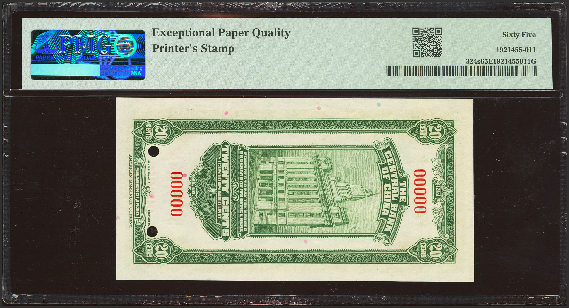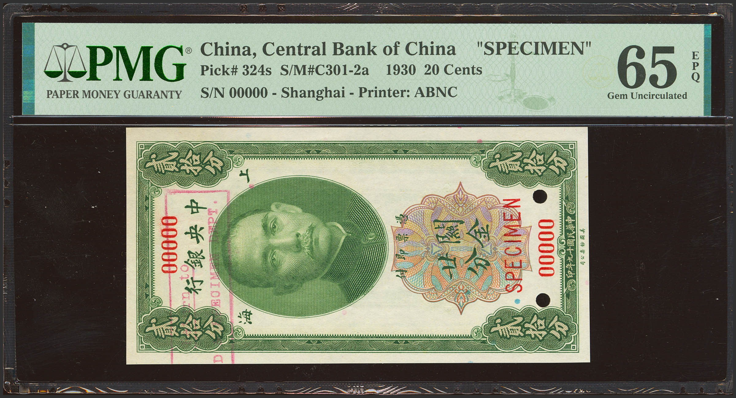 CHINA. 20 Cents. 1930. Central Bank of China. Specimen. (Pick: 324s, SM: C301-2a). PMG65EPQ (printer's stamp).