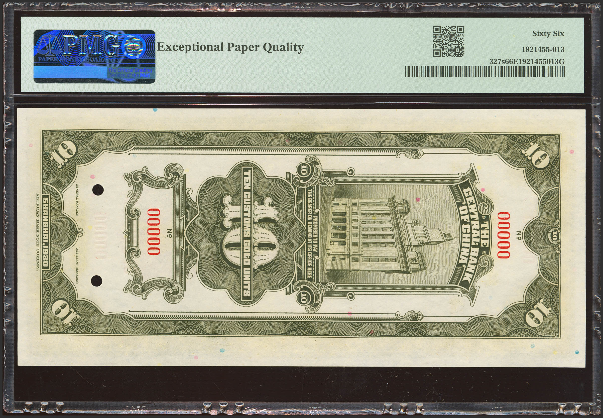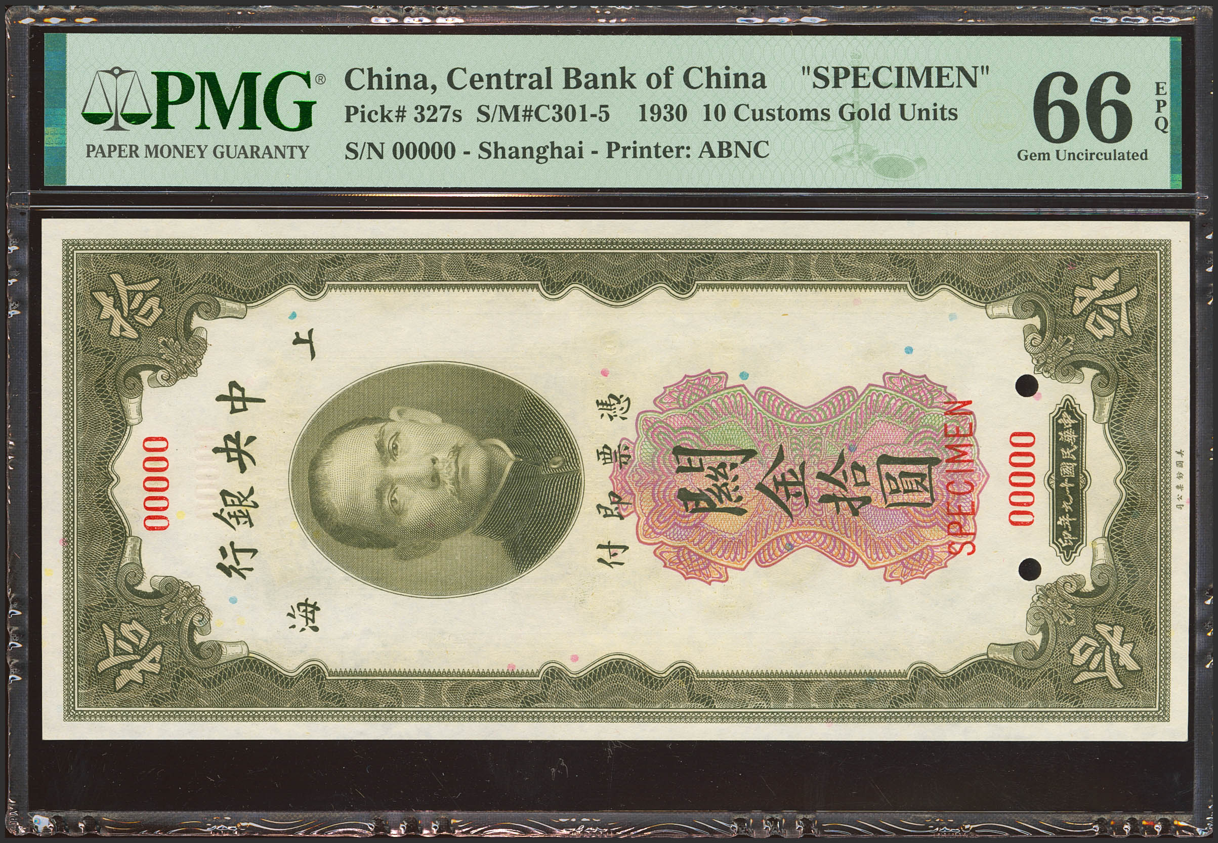 CHINA. 10 Custom gold units. 1930. Central Bank of China. Specimen. (Pick: 327s, SM: C301-5). PMG66EPQ.