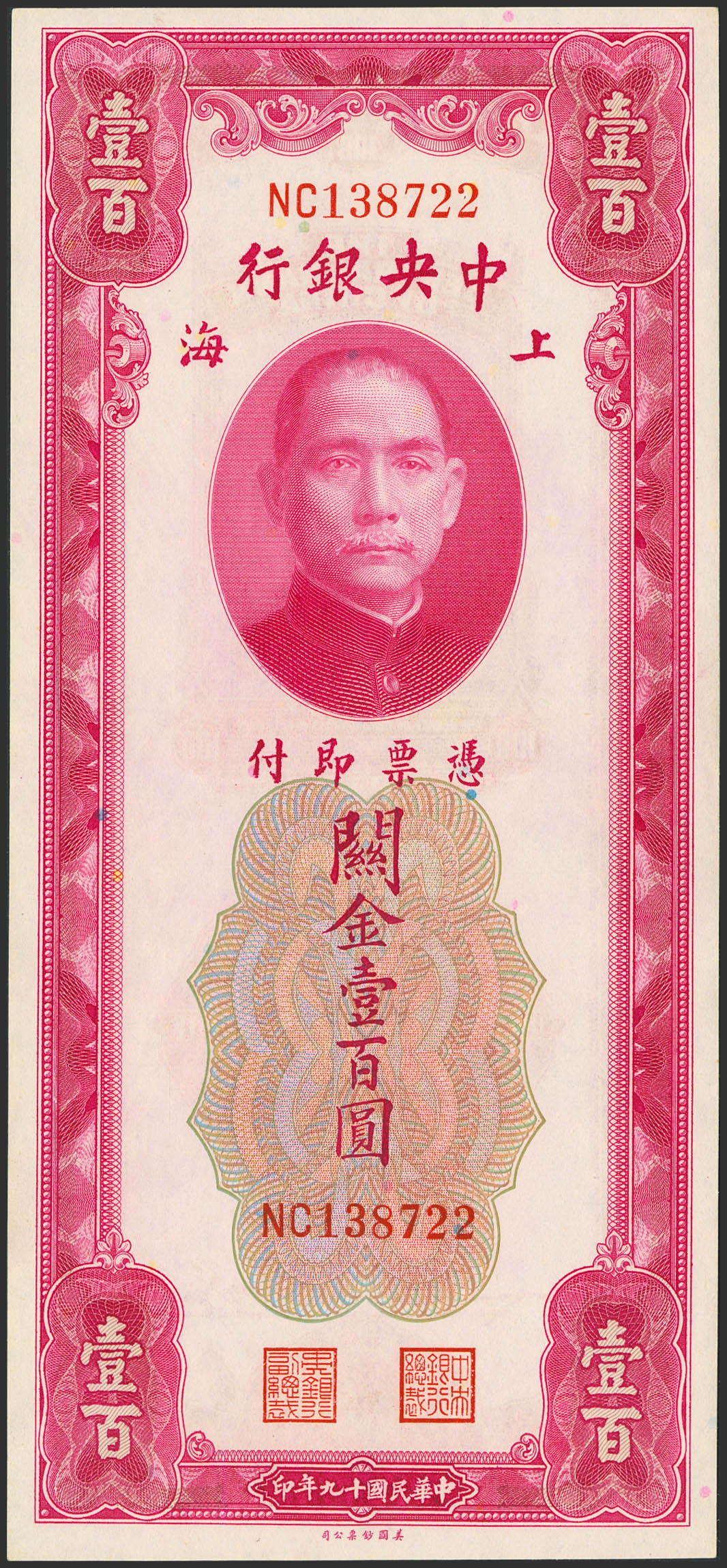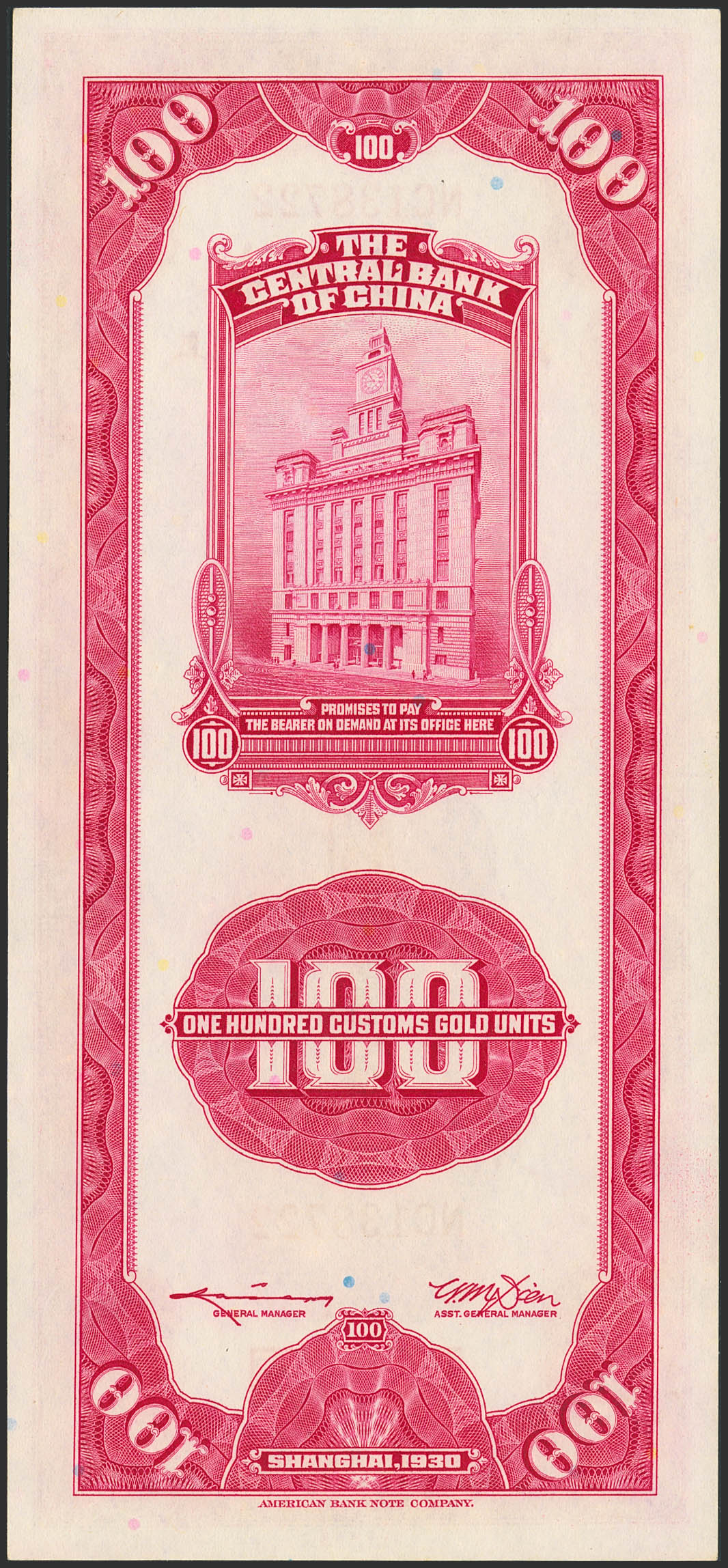 CHINA. 100 Custom gold units. 1930. Central Bank of China. (Pick: 330). Almost Uncirculated.