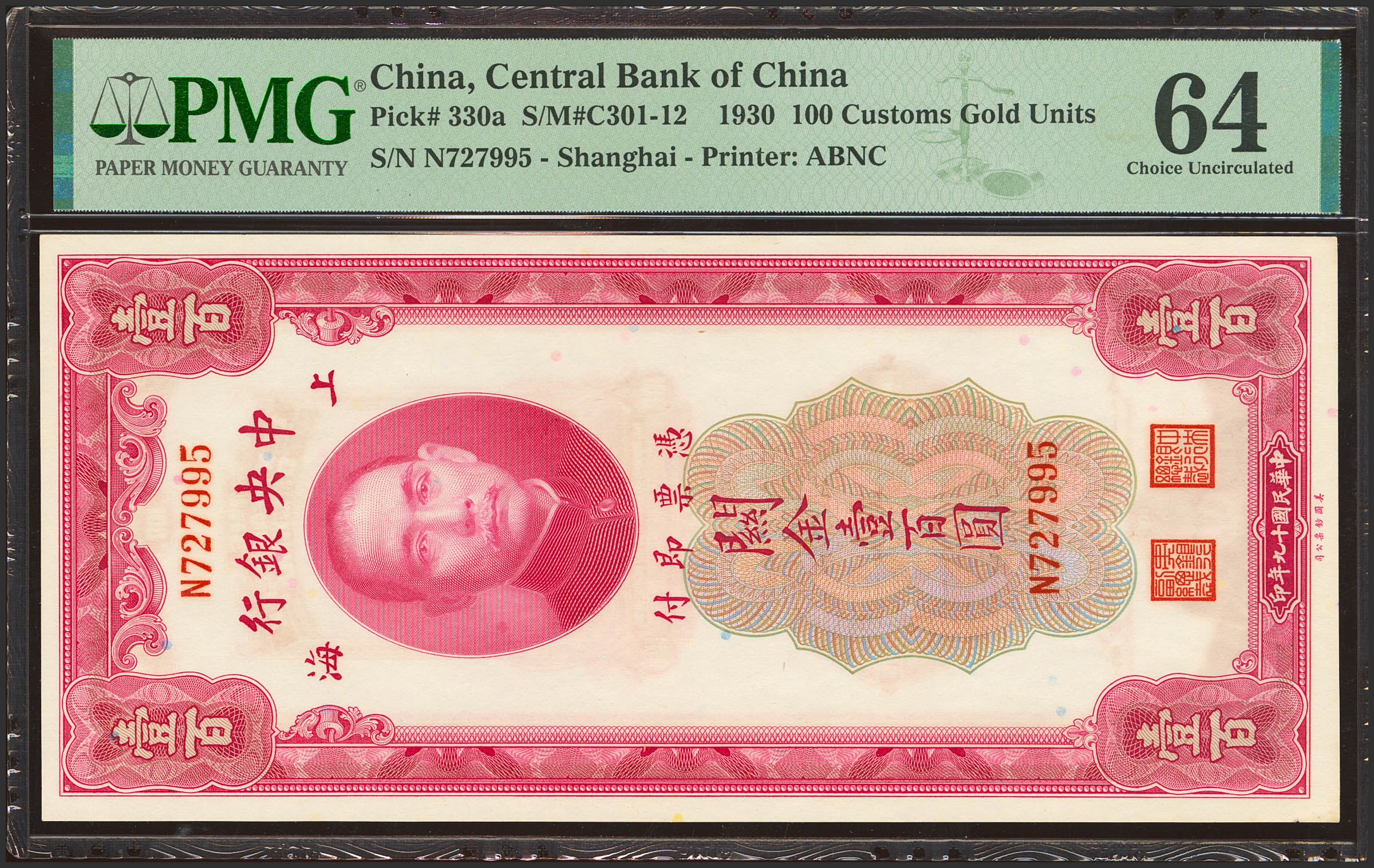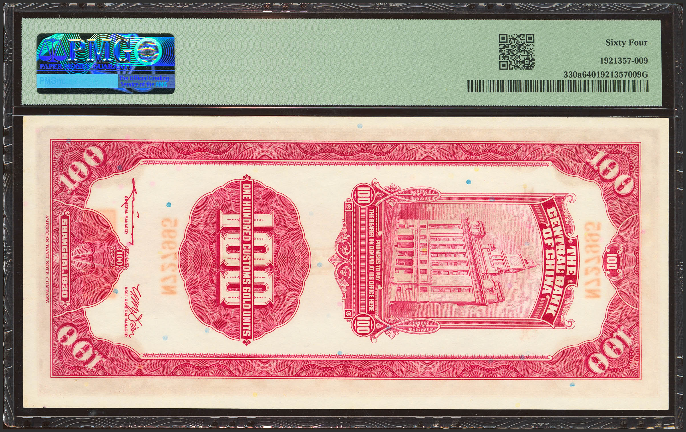 CHINA. 100 Custom gold units. 1930. Central Bank of China. (Pick: 330, SM: C301-12). PMG64.