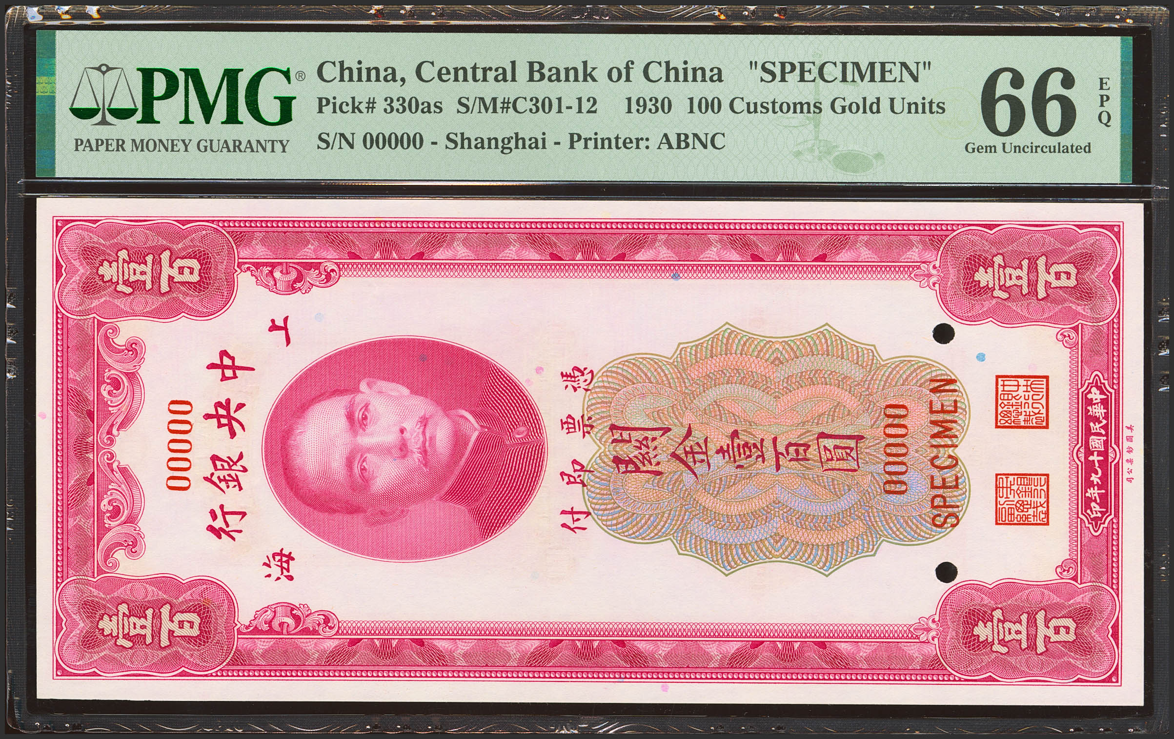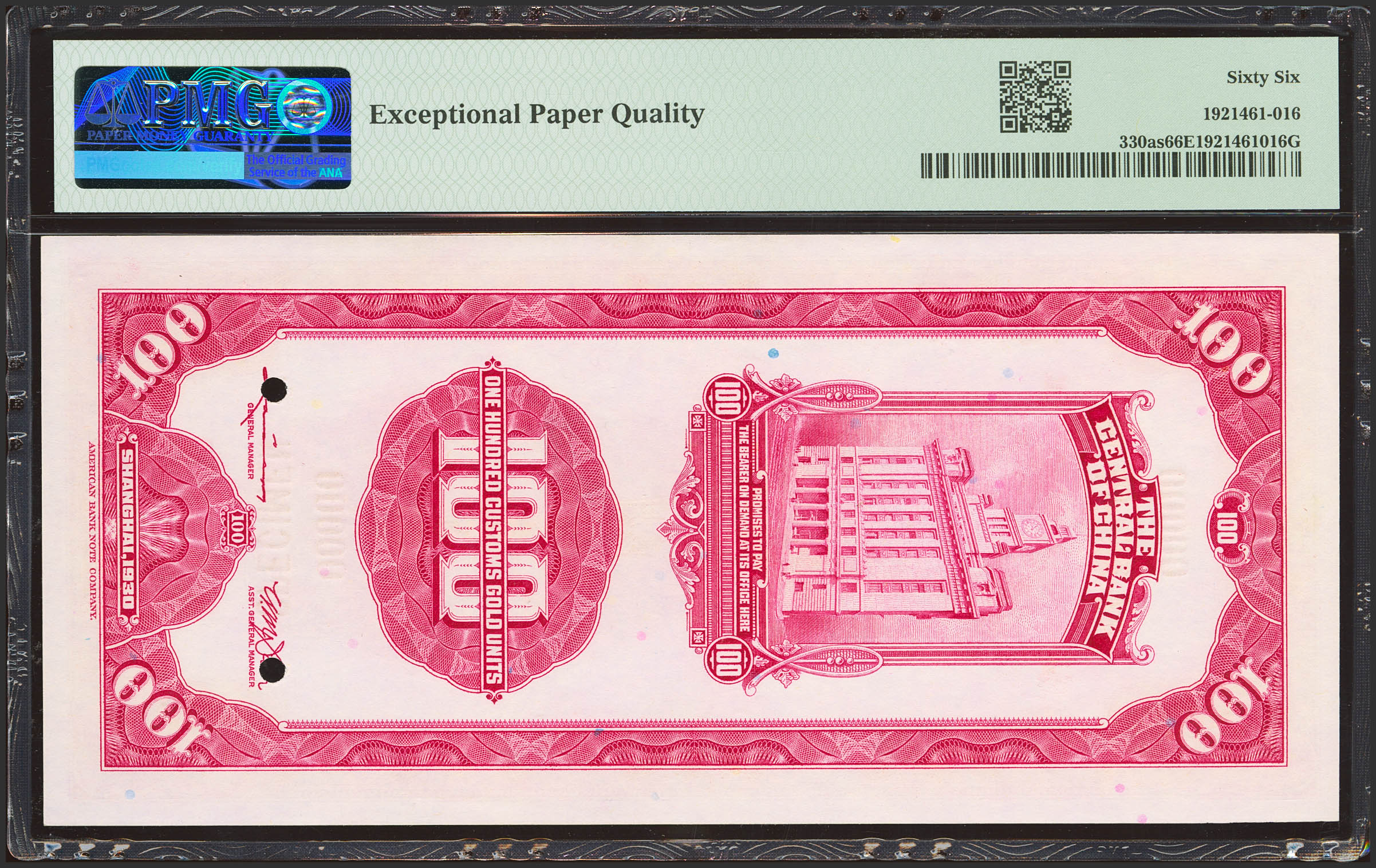CHINA. 100 Custom gold units. 1930. Central Bank of China. Specimen. (Pick: 330as, SM: 301-12). PMG66EPQ.