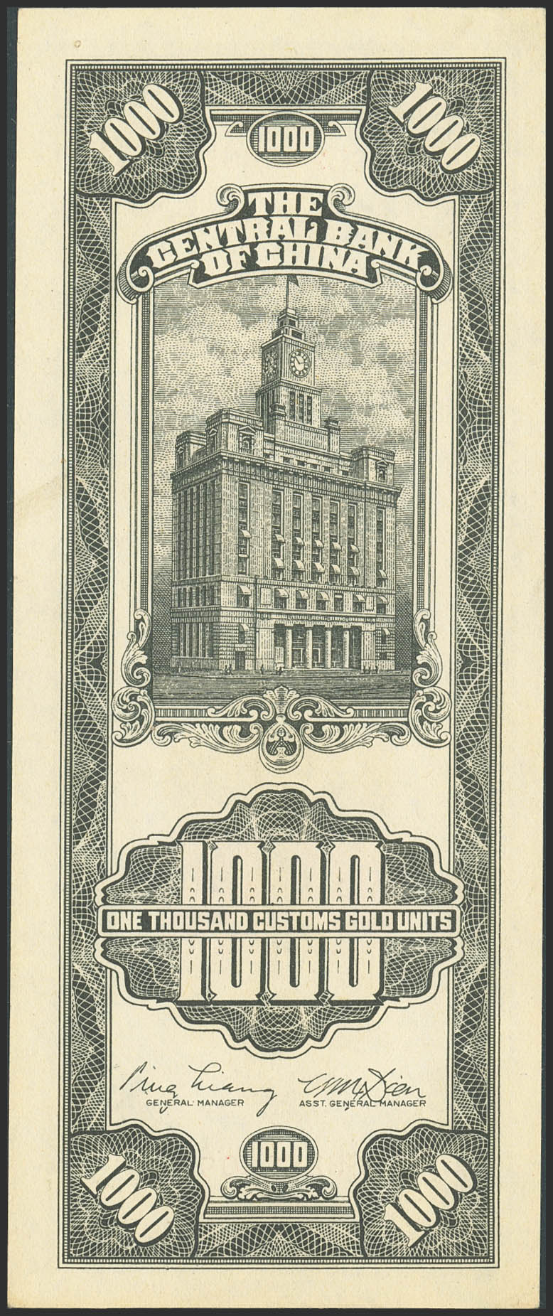 CHINA. 1000 Custom gold units. 1947. Central Bank of China. 8 characters in the printer's name. (Pick: 339a). Uncirculated.