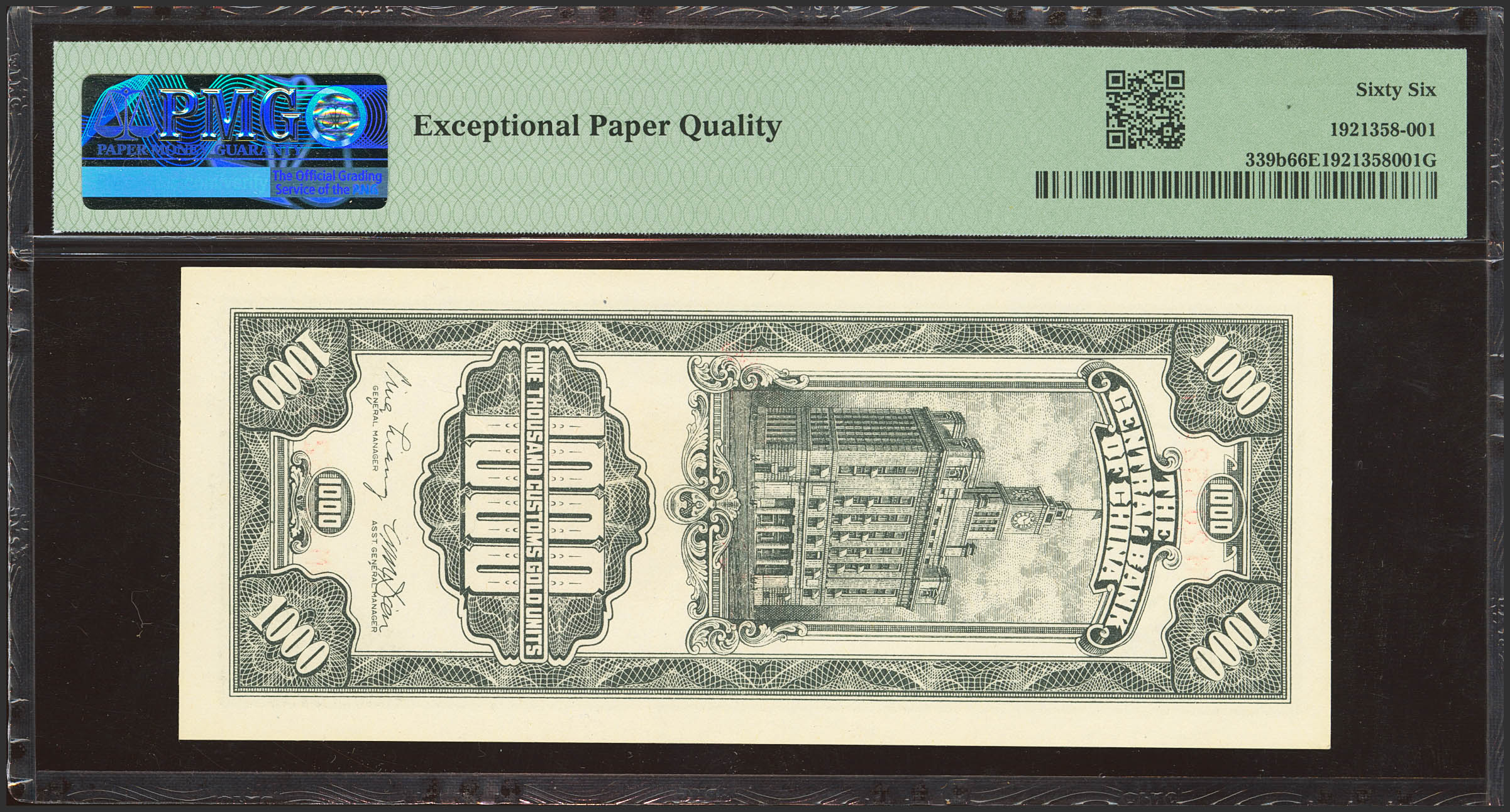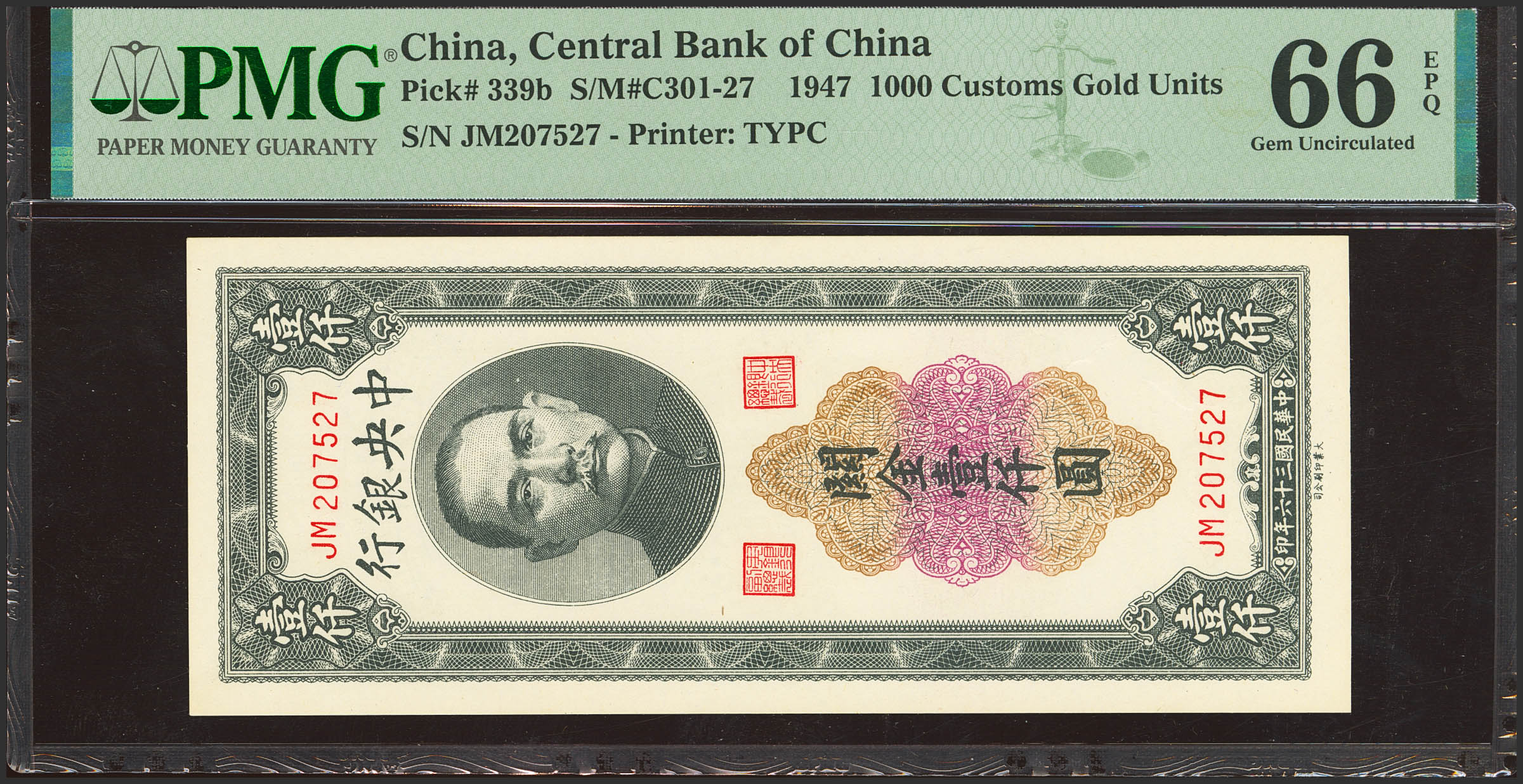 CHINA. 1000 Custom gold units. 1947. Central Bank of China. 6 characters in the printer's name. (Pick: 339b, SM: C301-27). PMG66EPQ.