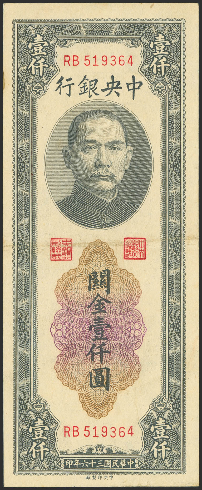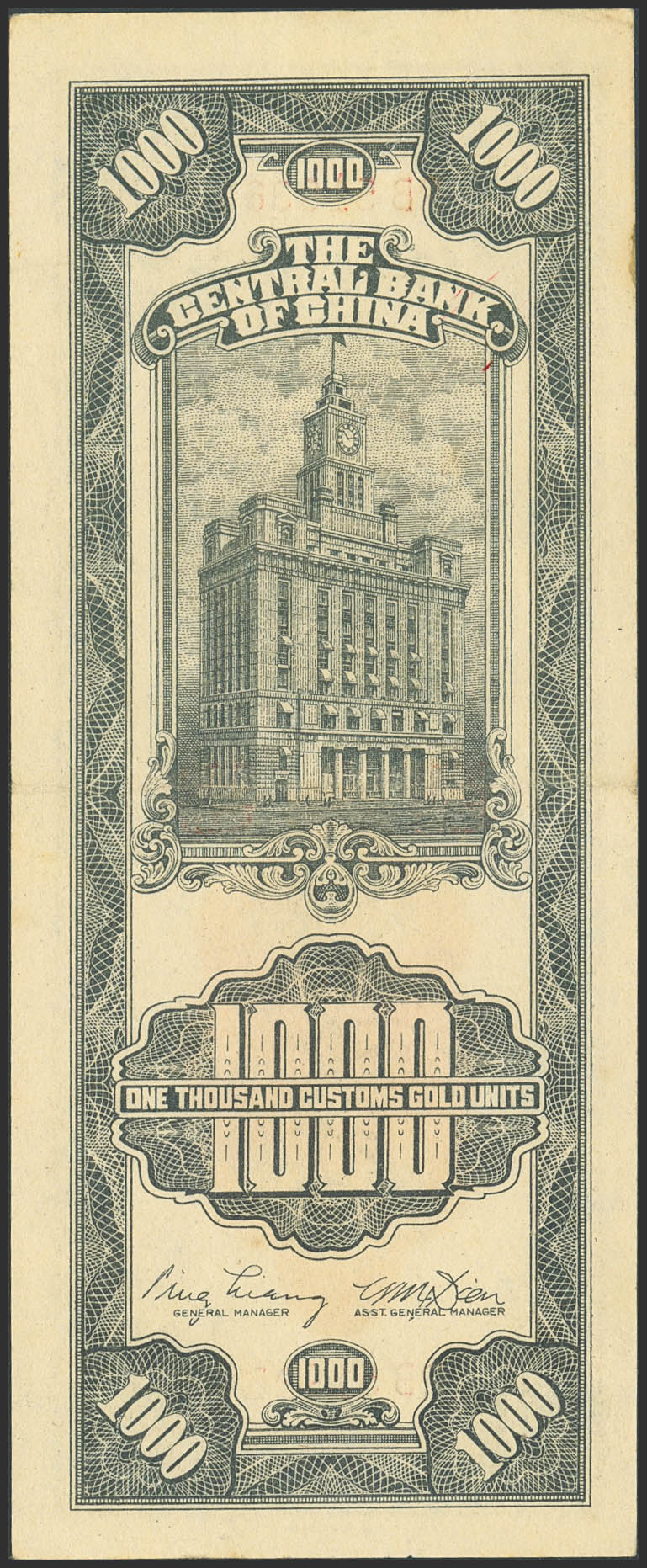 CHINA. 1000 Custom gold units. 1947. Central Bank of China. 5 characters in the printer's name. (Pick: 339c). Almost Uncirculated.