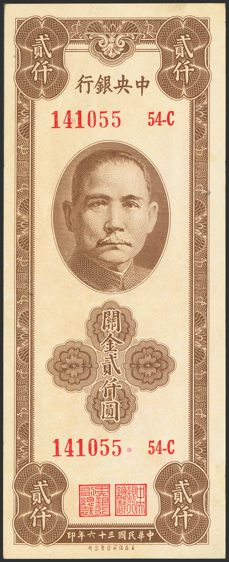 CHINA. 2000 Custom gold units. 1947. Central Bank of China. (Pick: 341). Almost Uncirculated.