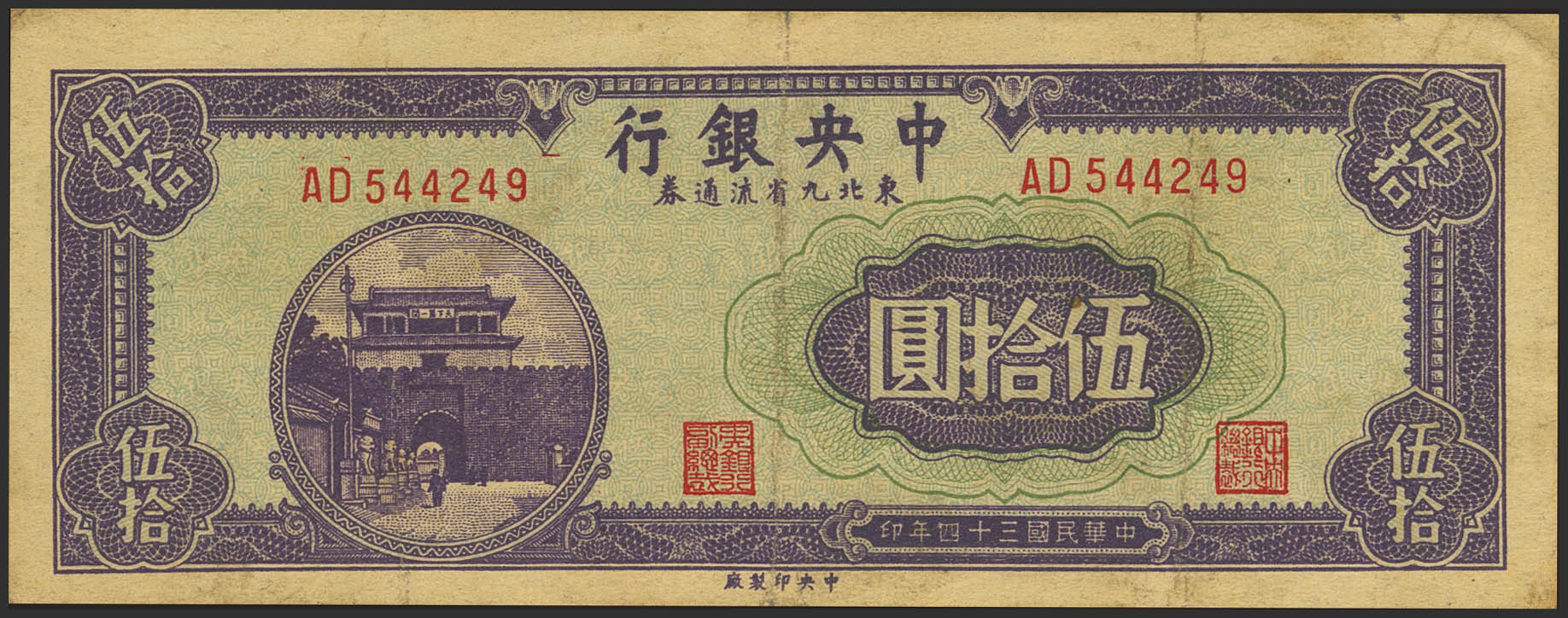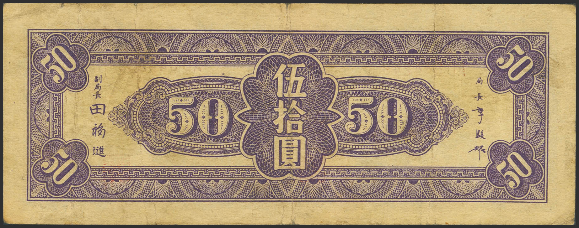 CHINA. 50 Yuan. 1945. Central Bank of China. Nine Northeastern Provinces. (Pick: 378). Very Fine.