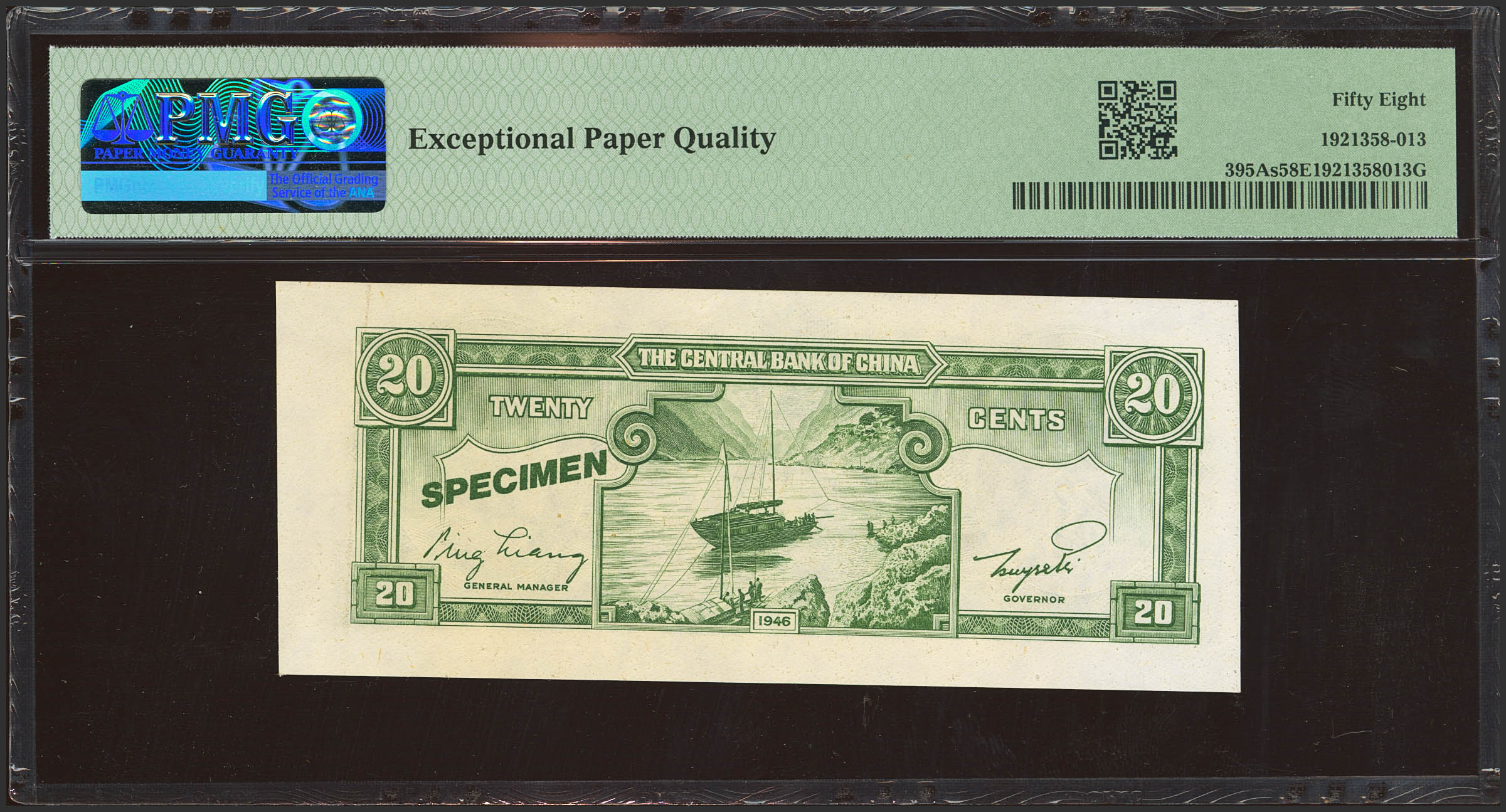 CHINA. 20 Cents. 1946. Central Bank of China. Specimen. (Pick: 395As, SM: C302). PMG58EPQ.
