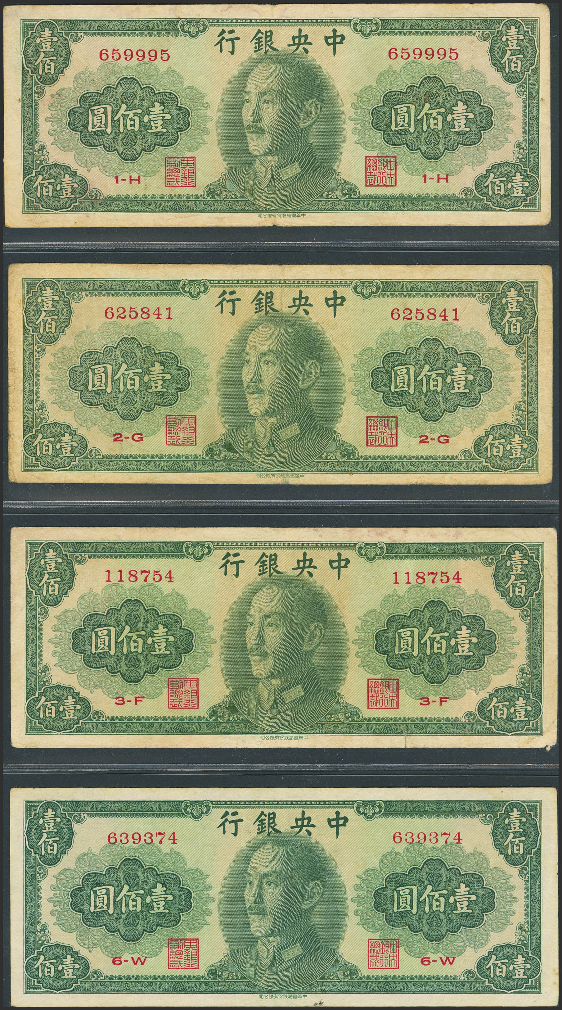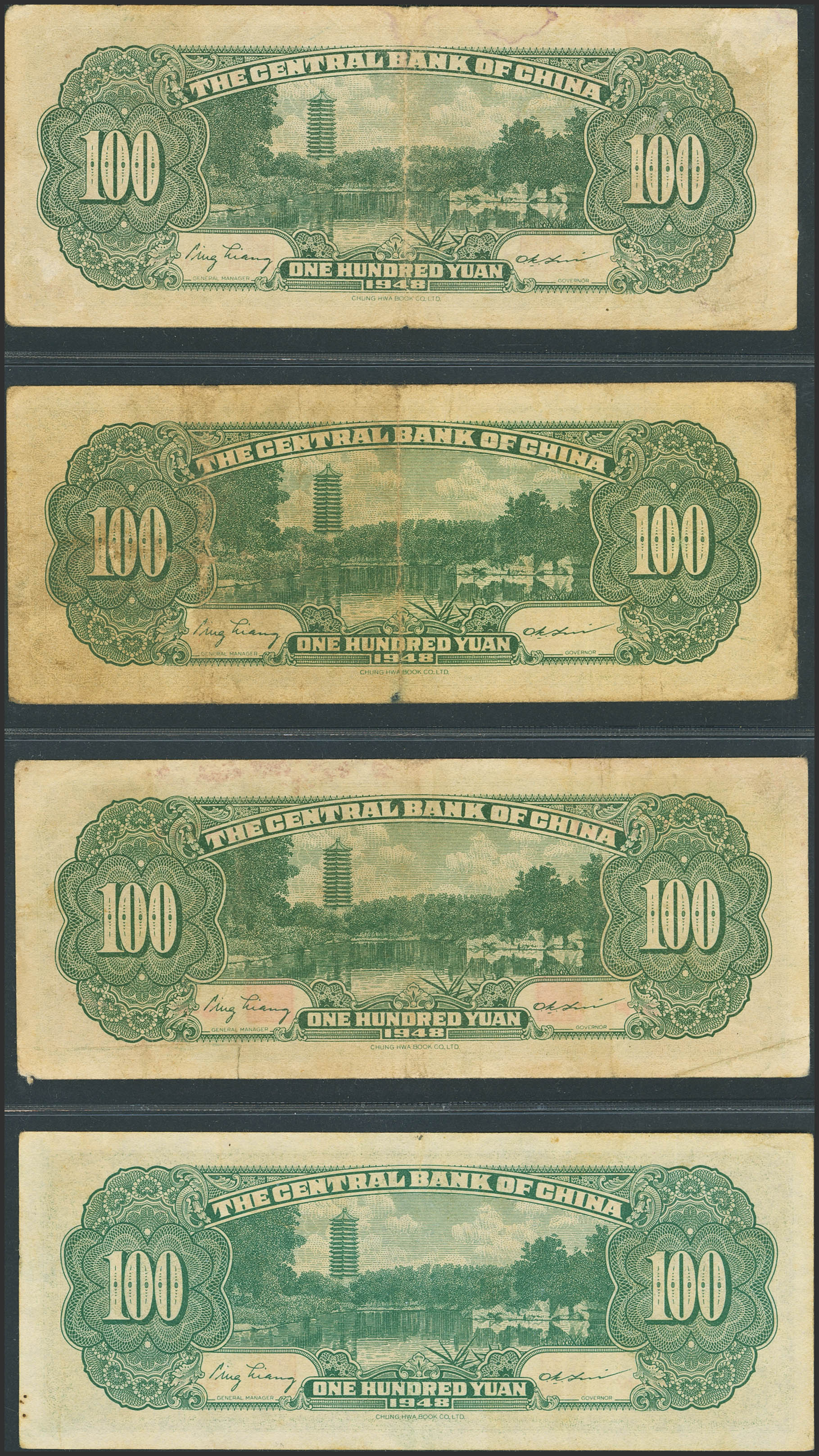 CHINA. Lot of 4 notes of 100 Yuan. 1948. Central Bank of China. (Pick: 406). Fine to Very Fine.