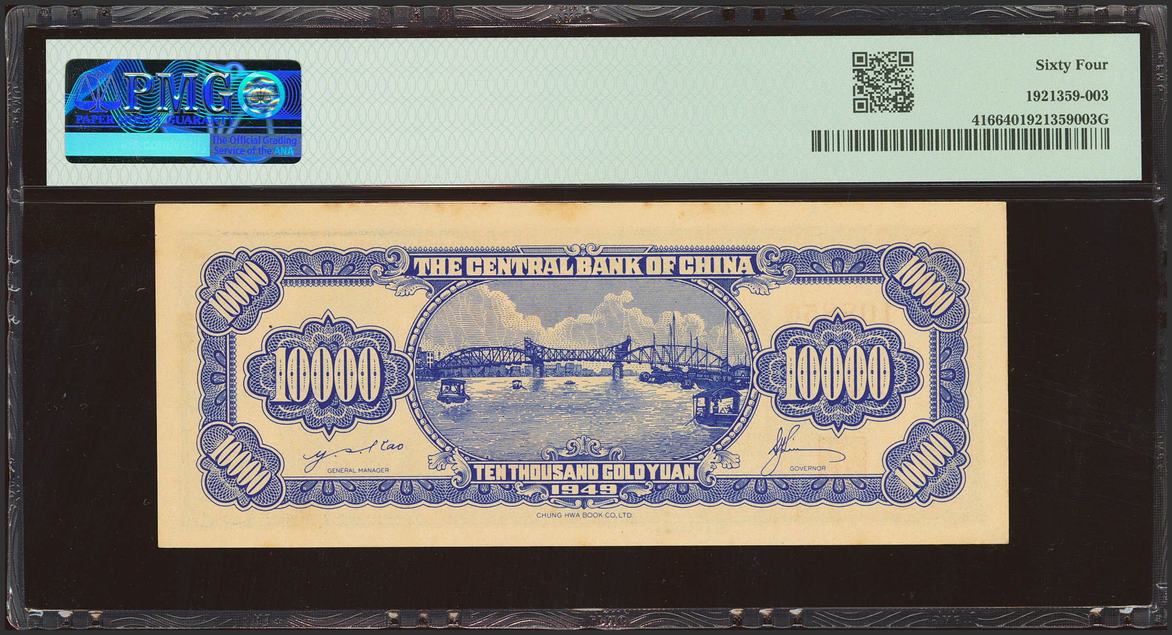 CHINA. 10000 Gold Yuan. 1949. Central Bank of China. (Pick: 416, SM: C302-61). Rust on top edge. PMG64.