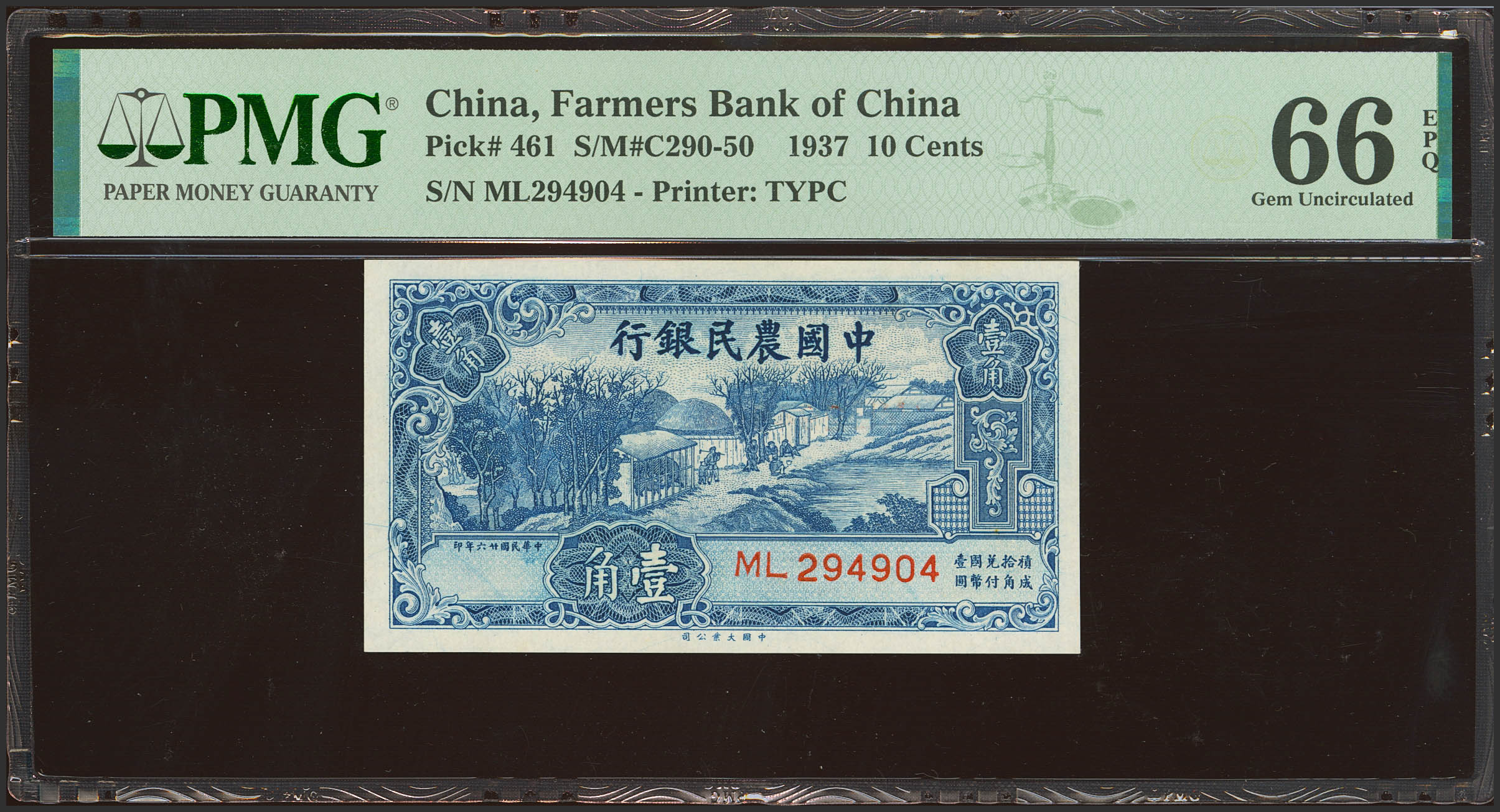 CHINA. 10 Cents. 1937. Farmers Bank of China. (Pick: 461, SM: C290-50). PMG66EPQ.