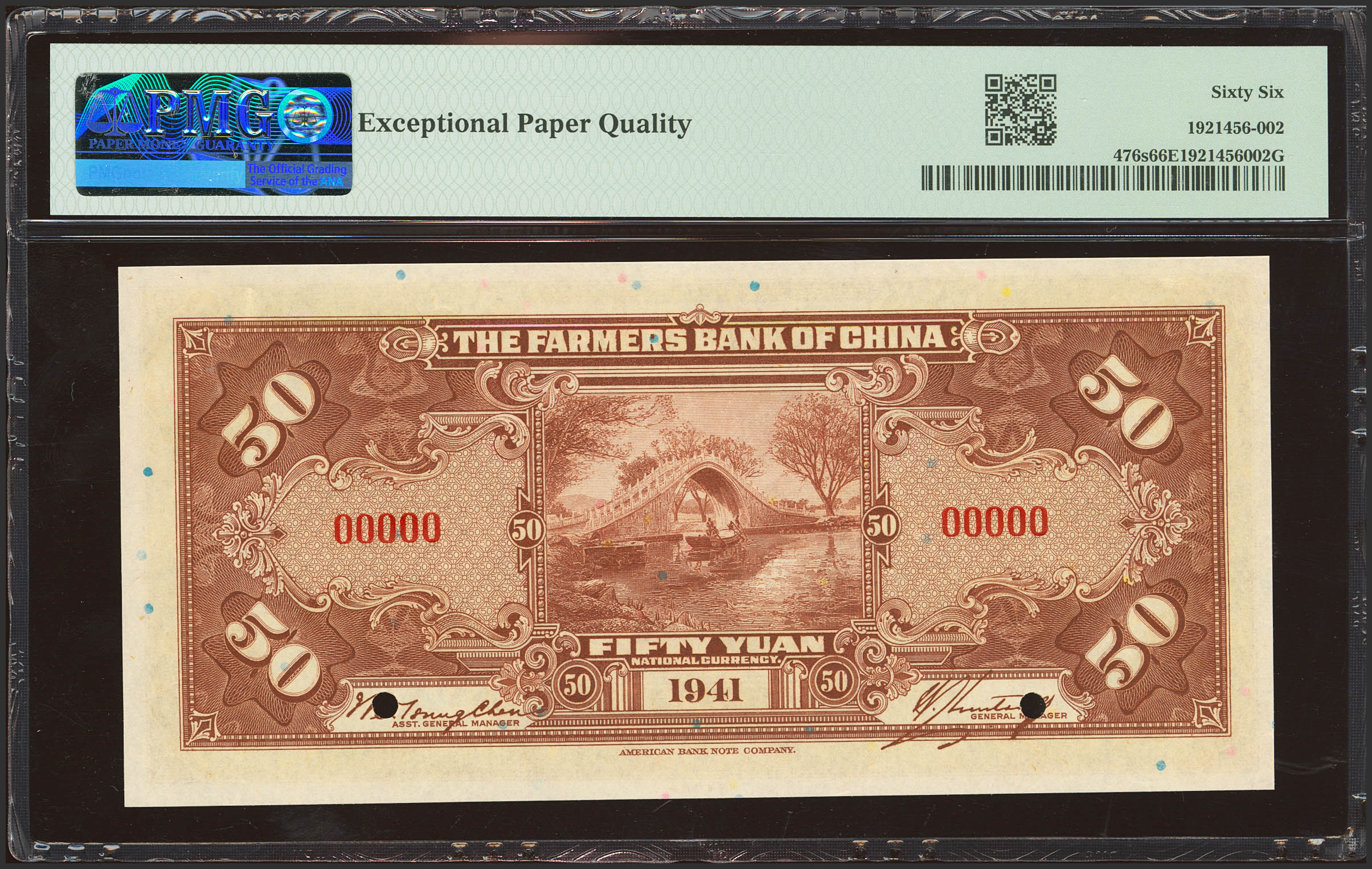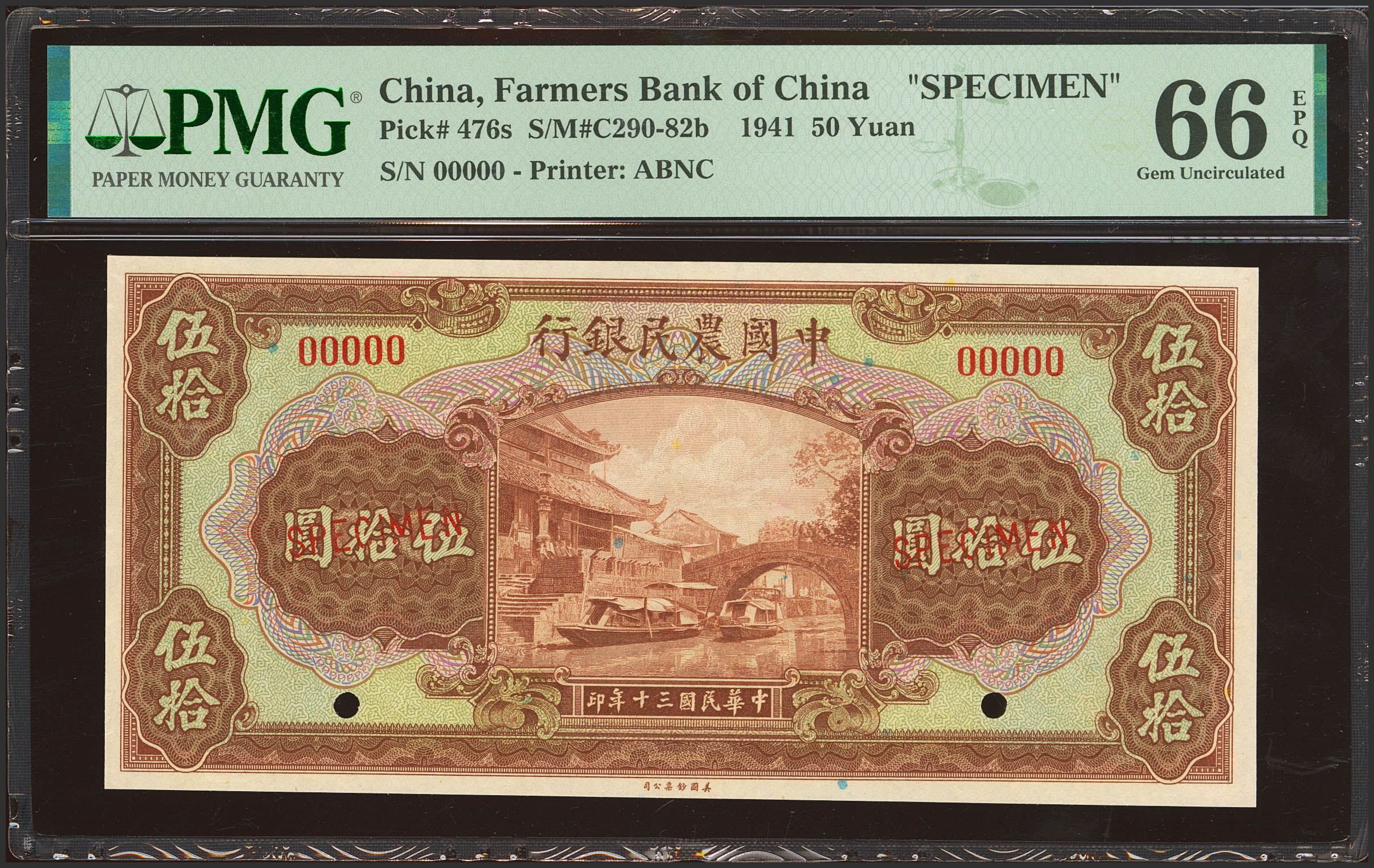 CHINA. 50 Yuan. 1941. Farmers Bank of China. Specimen. (Pick: 476s, SM: C290-82b). PMG66EPQ (according to the PMG population report, it is the third highest qualified banknote as of 15 February 2025).