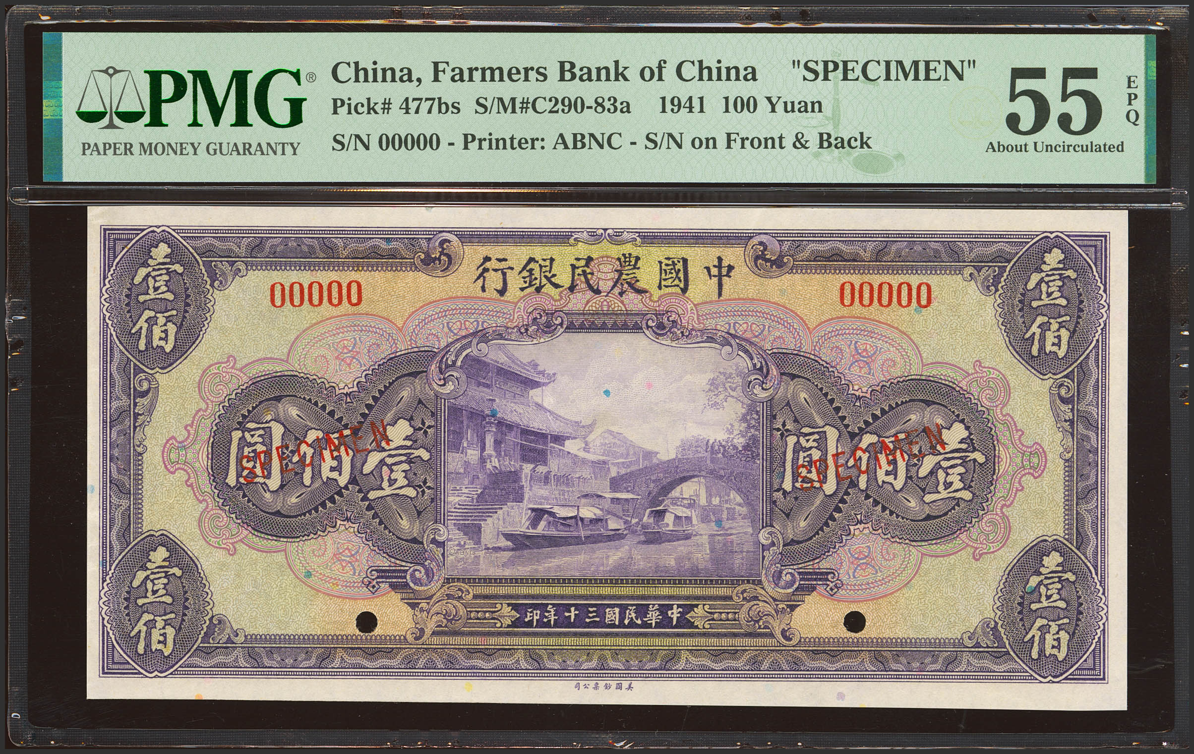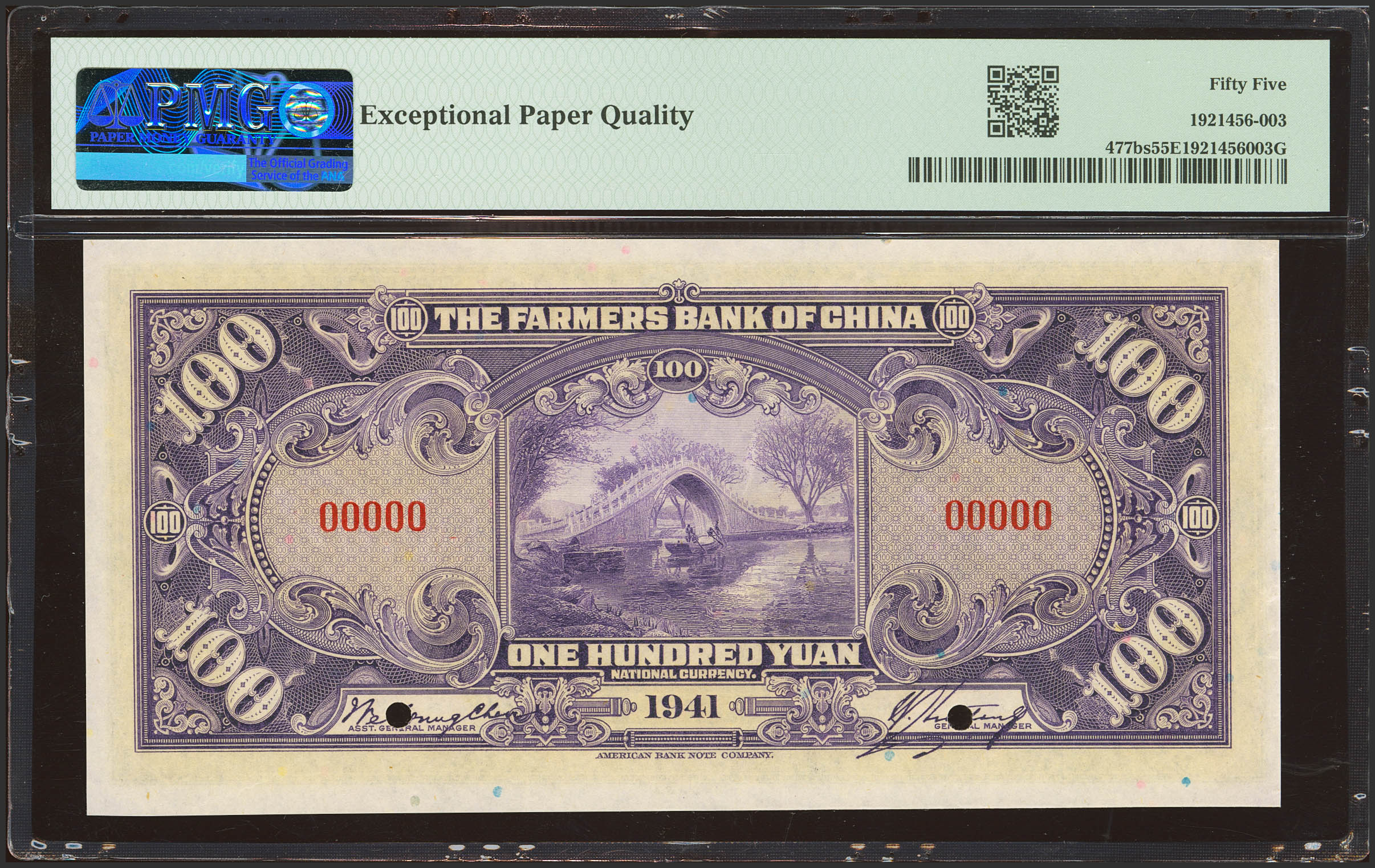 CHINA. 100 Yuan. 1941. Farmers Bank of China. Specimen. (Pick: 477bs, SM: C290-83a). PMG55EPQ.