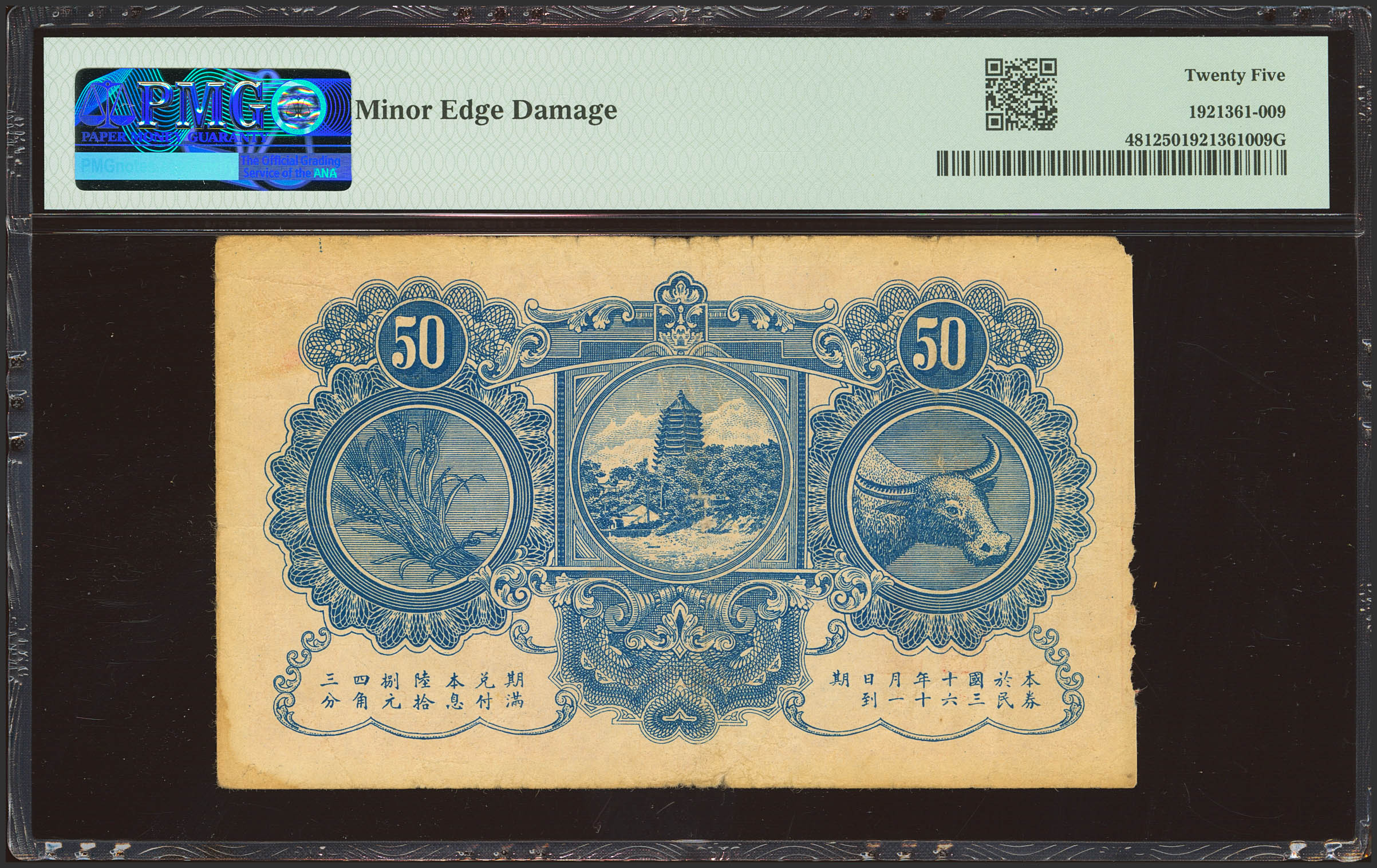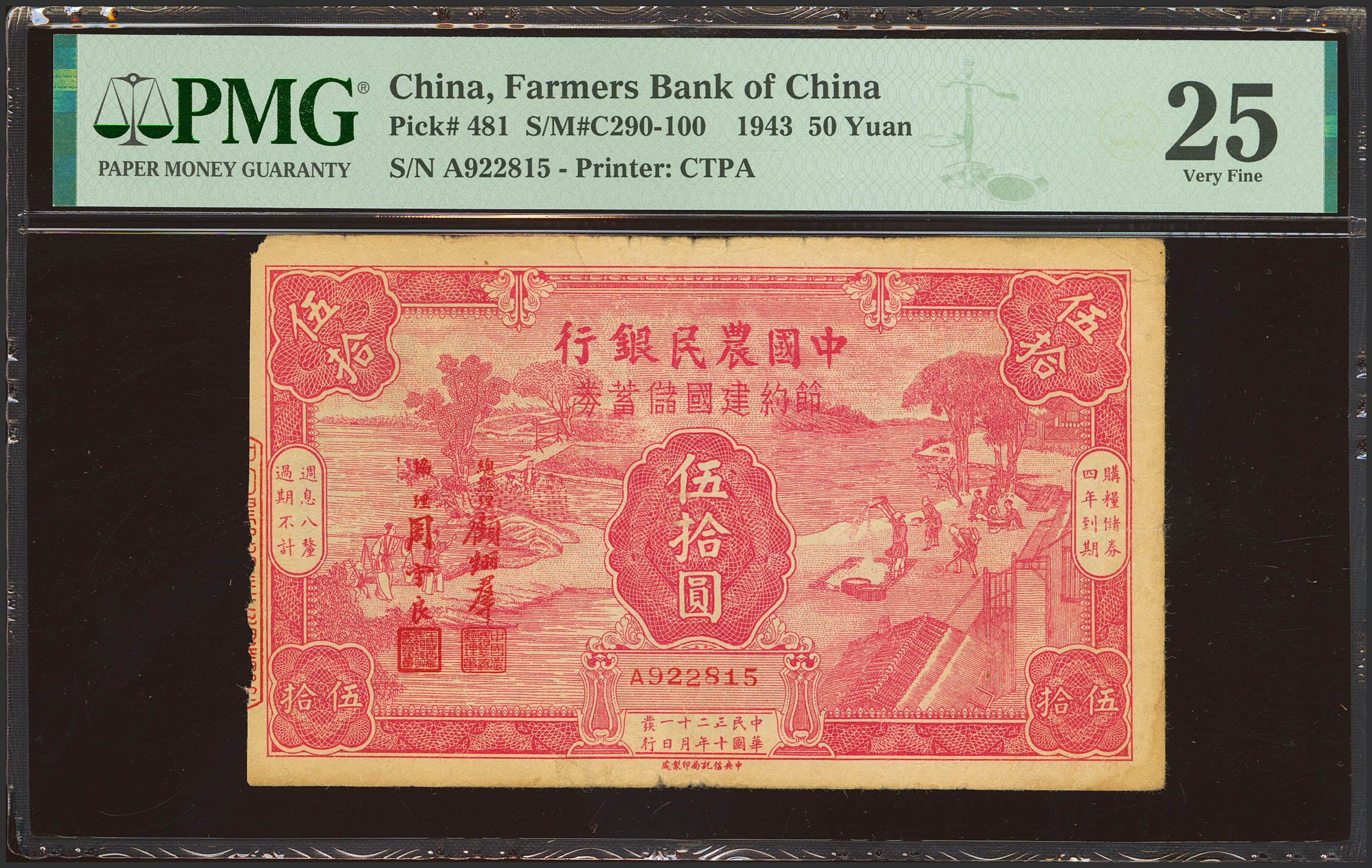 CHINA. 50 Yuan. 1943. Farmers Bank of China. (Pick: 481, SM: C290-100). PMG25 (minor edge damage).