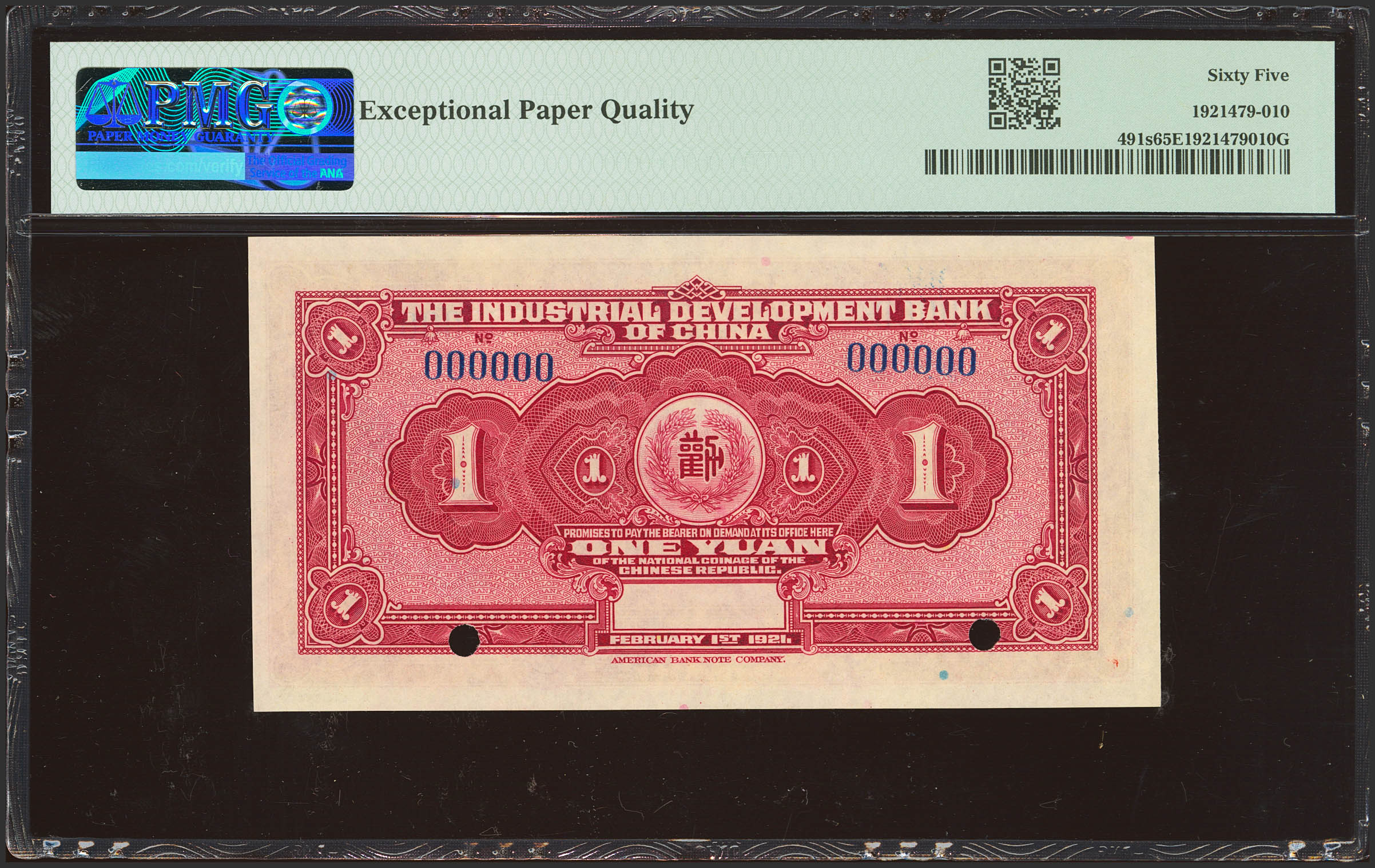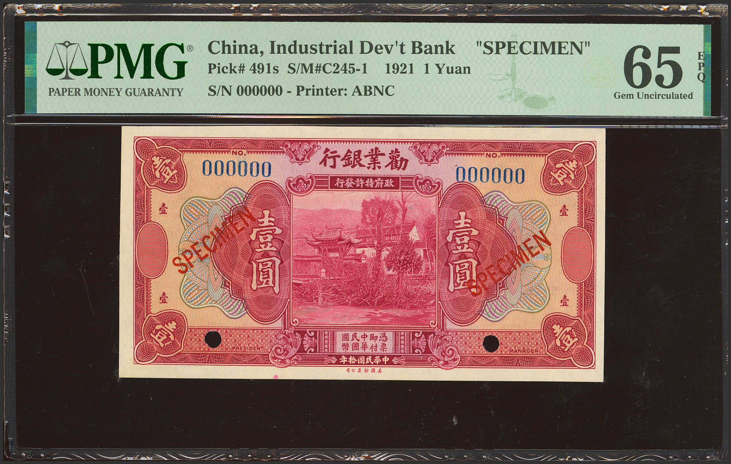 CHINA. 1 Yuan. 1 February 1921. Industrial Development Bank of China. Specimen. (Pick: 491s, SM: C245-1). PMG65EPQ.