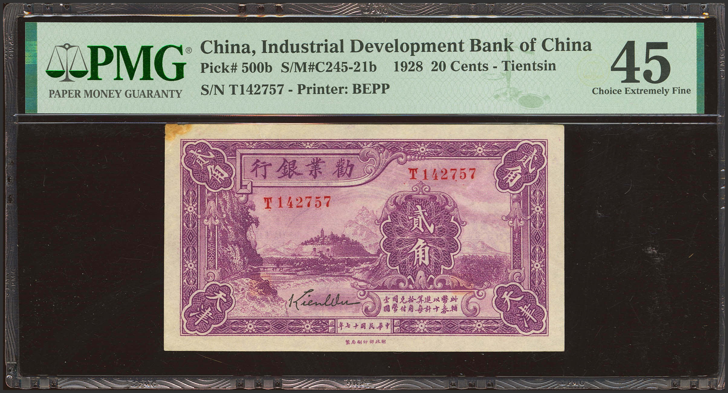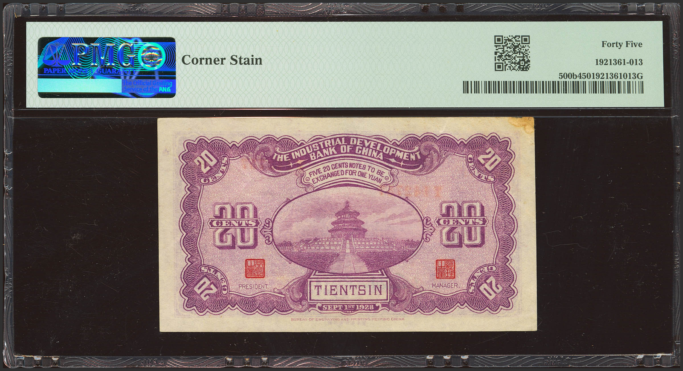 CHINA. 20 Cents. 1 September 1928. Industrial Development Bank of China. Tientsin. (Pick: 500b, SM: C245-21b). PMG45 (corner stain).