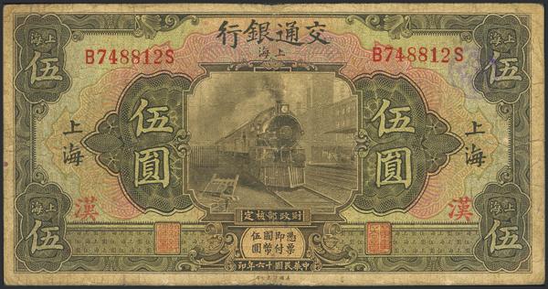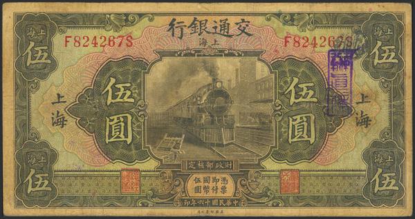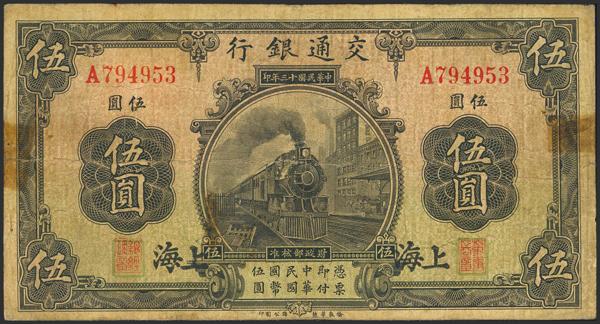 CHINA. 5 Yuan. 1 July 1924. Shanghai. Bank of Communications. (Pick: 135a). Pinholes, traces of tape and tears. Very Good.