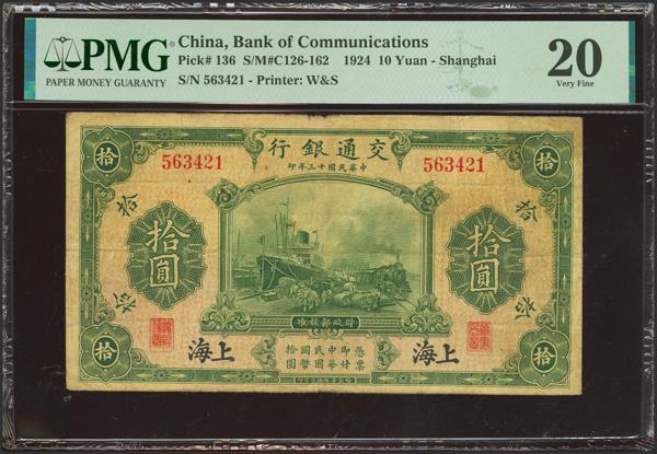 CHINA. 10 Yuan. 1 July 1924. Shanghai. Bank of Communications. (Pick: 136, SM: C126-162). PMG20 (spindle hole).