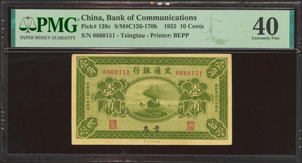 CHINA. 10 Cents. 1 July 1925. Bank of Communication.Tsingtau. (Pick: 138c, SM: C126-170b). PMG40.