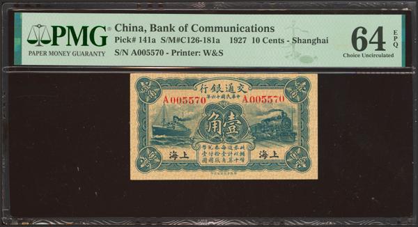 CHINA. 10 Cents. 1 January 1927. Bank of Communication. Shanghai. (Pick: 141a, SM: 126-181a). PMG64EPQ.