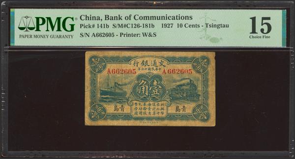 CHINA. 10 Cents. 1 January 1927. Bank of Communication. Shanghai. (Pick: 141b, SM: C126-181b). PMG15.