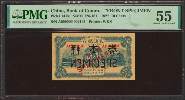 CHINA. 10 Cents. 1 January 1927. Bank of Communication. Front Specimen. (Pick: 141s1, SM: C126-181). PMG55.
