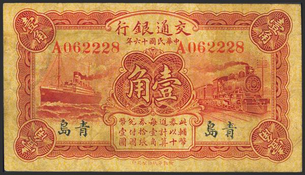 CHINA. 10 Cents. 1 January 1927. Bank of Communication. Tsingtau. (Pick: 142a). Fine.