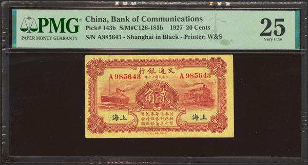 CHINA. 20 Cents. 1 January 1927. Bank of Communication. Shanghai. (Pick: 143b, SM: C126-183b). PMG25.