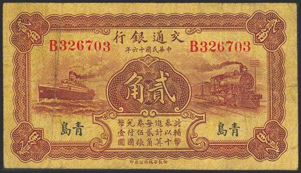 CHINA. 20 Cents. 1 January 1927. Bank of Communication. Tsingtau. (Pick: 143e). Fine.
