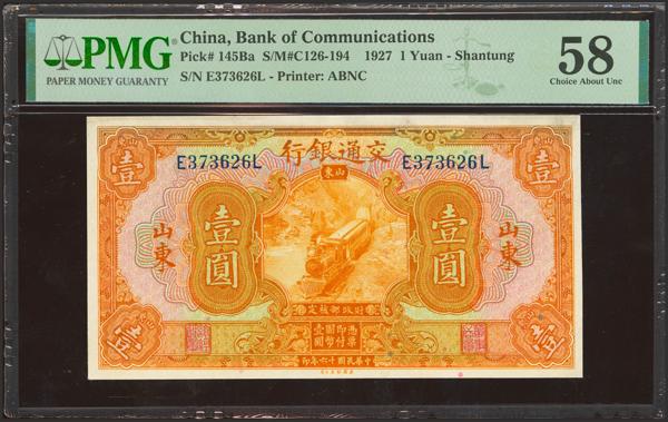 CHINA. 1 Yuan. 1 November 1927. Shangtun. Bank of Communications. (Pick: 145Ba, SM: C126-194). PMG58 (stain).
