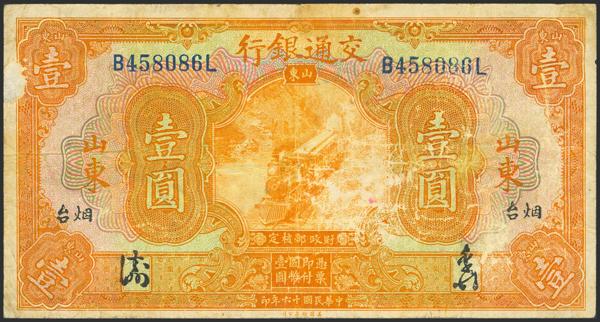 CHINA. 1 Yuan. 1 November 1927. Bank of Communications. Chefoo / Shantung. (Pick: 145Bb). Previously mounted. Fine.