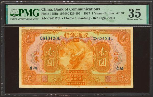 CHINA. 1 Yuan. 1 November 1927. Bank of Communications. Chefoo / Shantung. (Pick: 145Bc, SM: C126-195). PMG35 (toning).