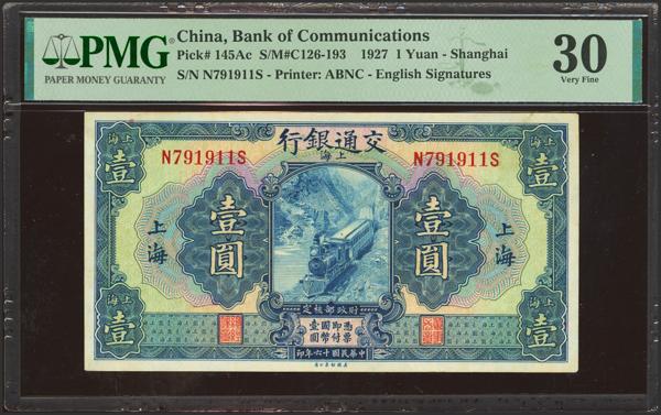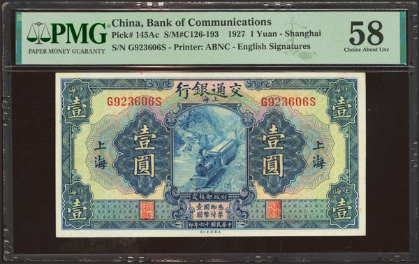 CHINA. 1 Yuan. 1 November 1927. Shanghai. Bank of Communications. (Pick: 145Ac, SM: C126-193). PMG58.