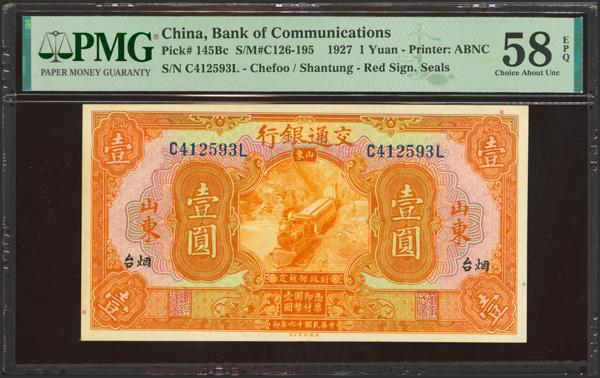CHINA. 1 Yuan. 1 November 1927. Bank of Communications. Chefoo / Shantung. (Pick: 145Bc, SM: C126-195). PMG58EPQ.