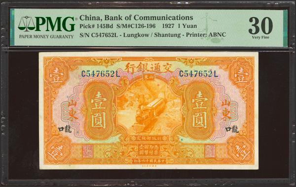 CHINA. 1 Yuan. 1 November 1927. Bank of Communications. Lungkow / Shantung. (Pick: 145Bd, SM: C126-196). PMG30.